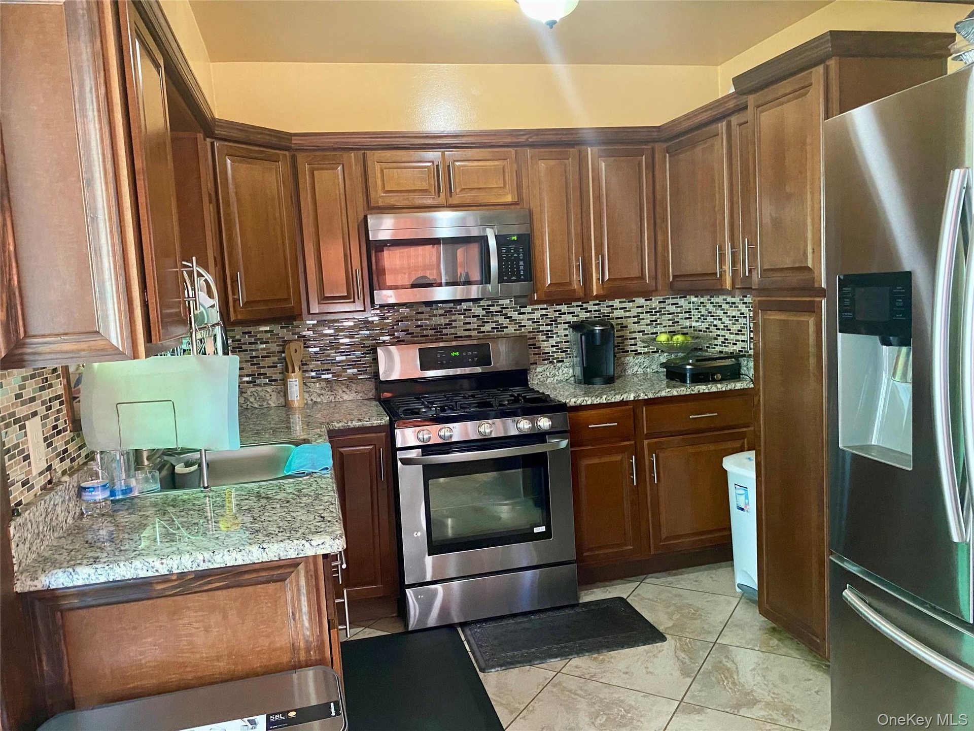 - Kitchen featuring stainless steel appliances, decorative backsplash, light stone countertops, and light tile patterned flooring