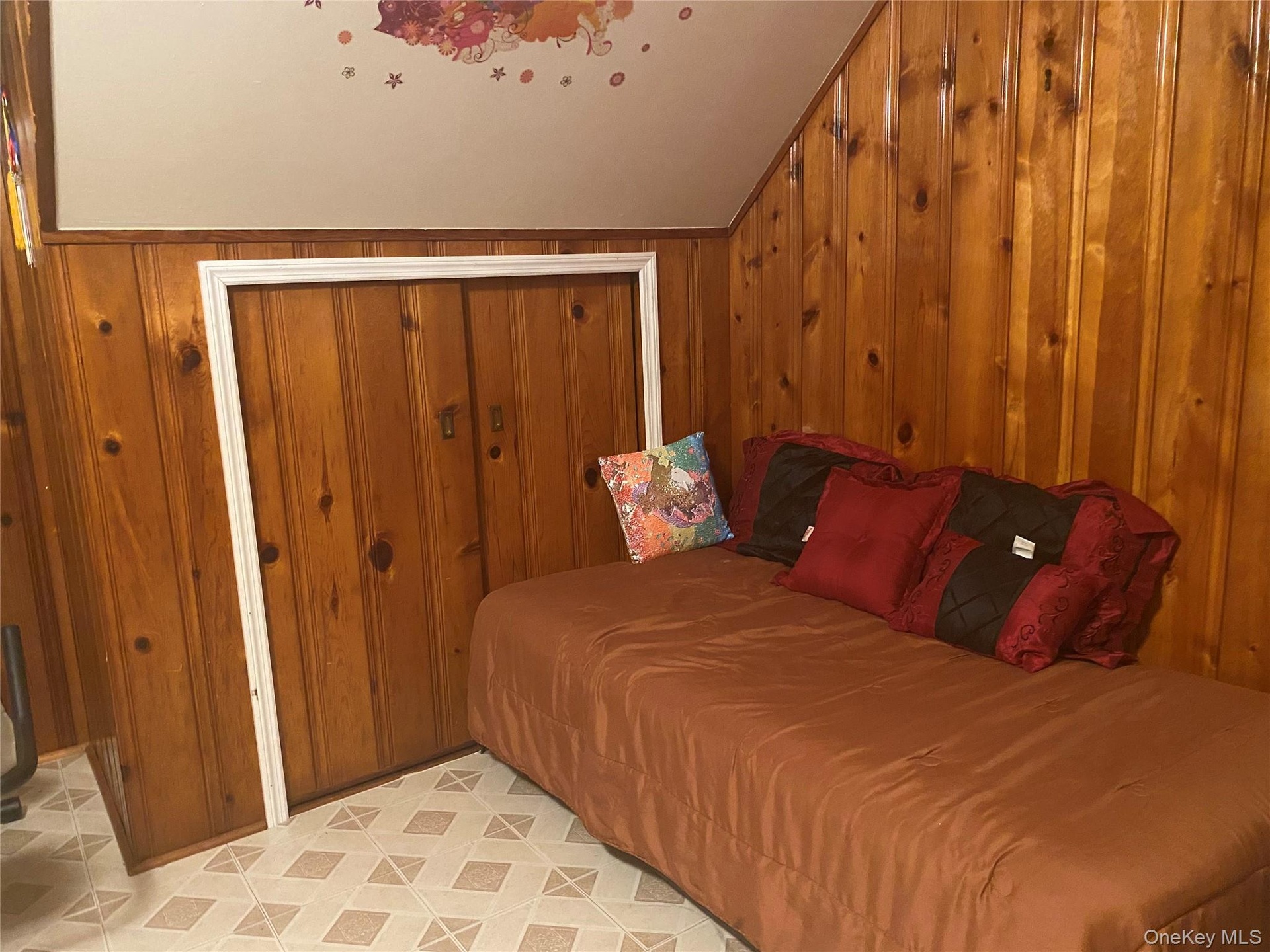 - Bedroom featuring wooden walls, lofted ceiling, and light floors