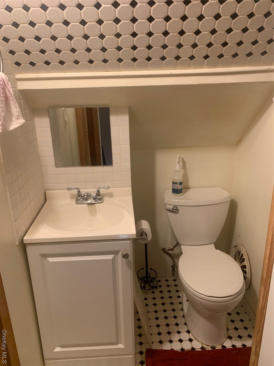 - Half bathroom featuring toilet, vanity, and tile patterned flooring