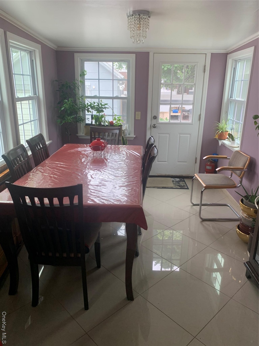 - Dining room featuring arched walkways, crown molding, and tile patterned floors