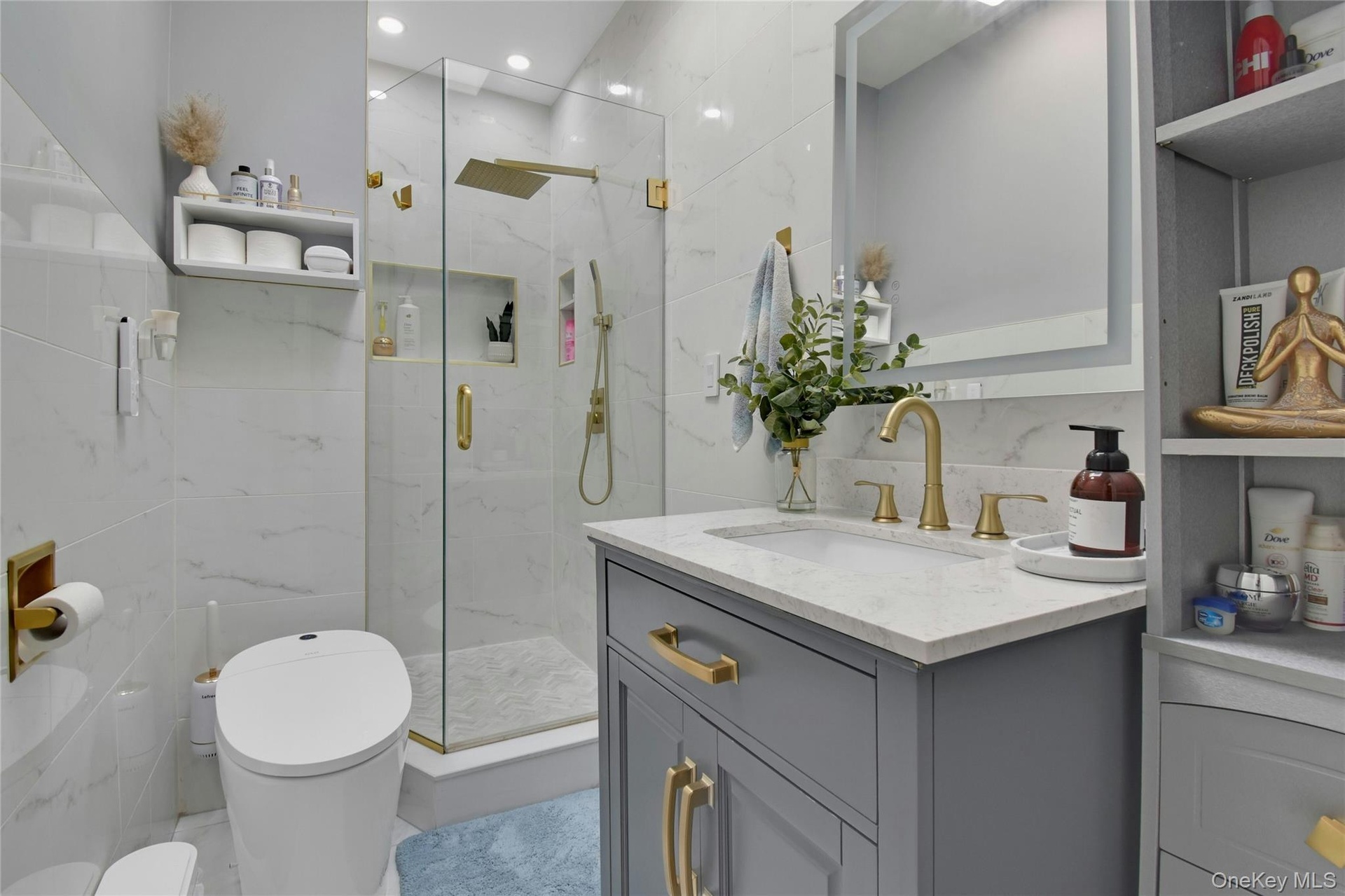 - New Second-floor full bathroom featuring a marble finish shower, toilet, vanity, and tile walls