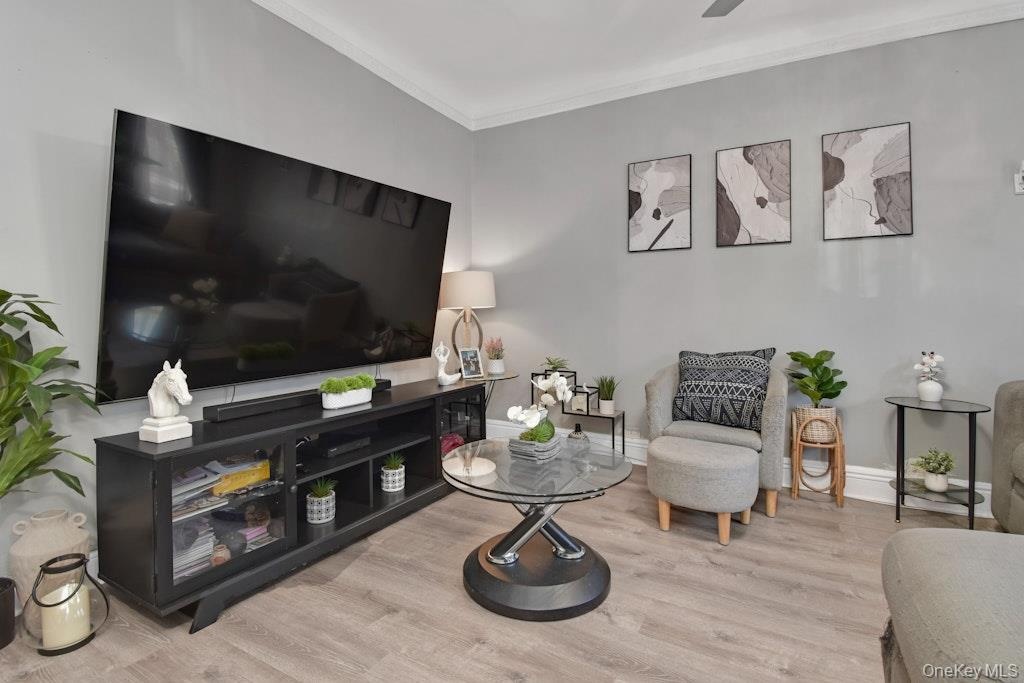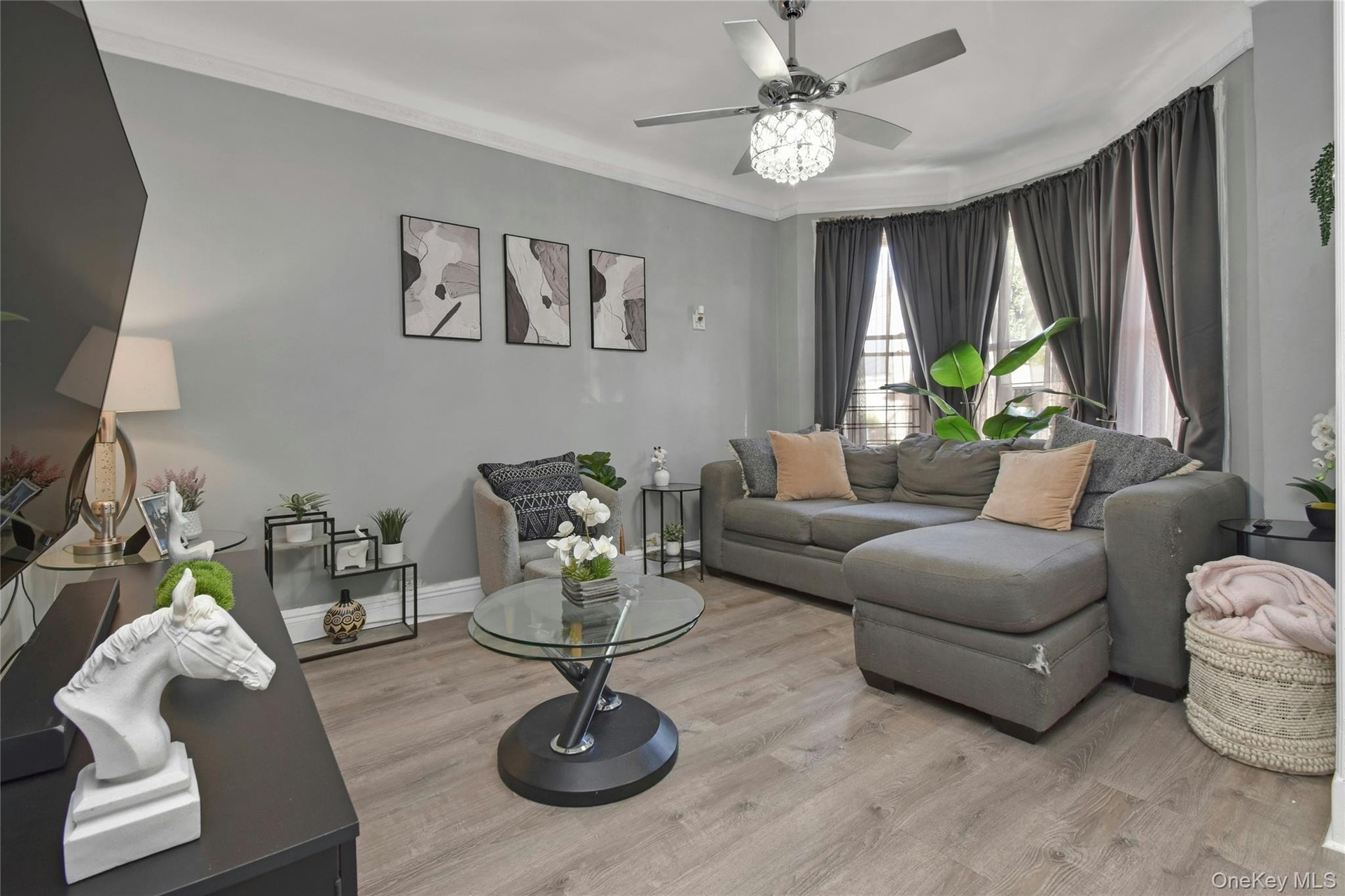 - Living area with wood-finished floors, ceiling fan, and crown moldings.