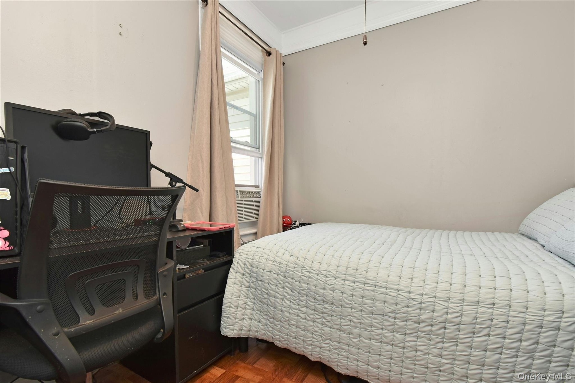 - Bedroom featuring ornamental molding, wood finished floors, and a ceiling fan
