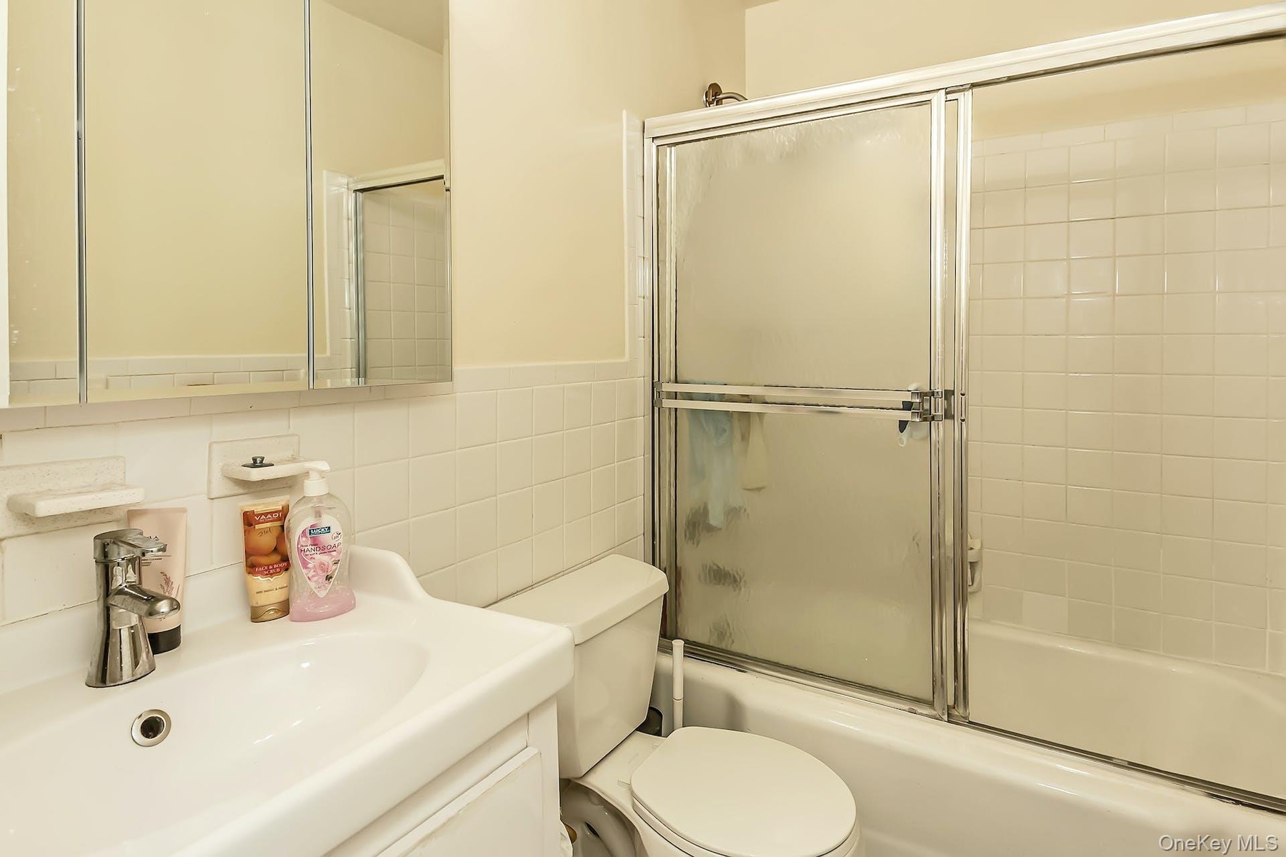 - Bathroom with tile walls, enclosed tub / shower combo, toilet, and vanity