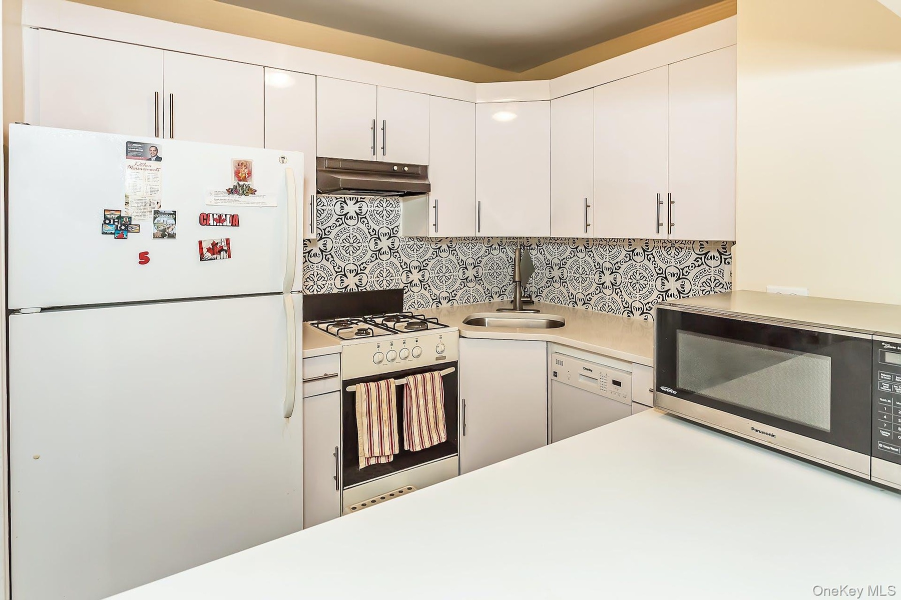 - Kitchen featuring white appliances, a sink, under cabinet range hood, light countertops, and white cabinetry