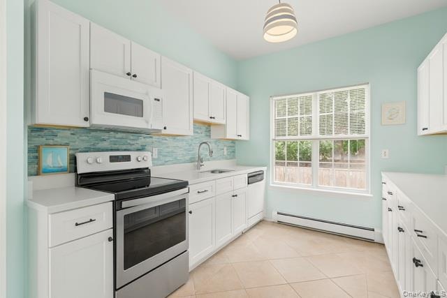 - Kitchen with white appliances, white cabinets, light countertops, and backsplash