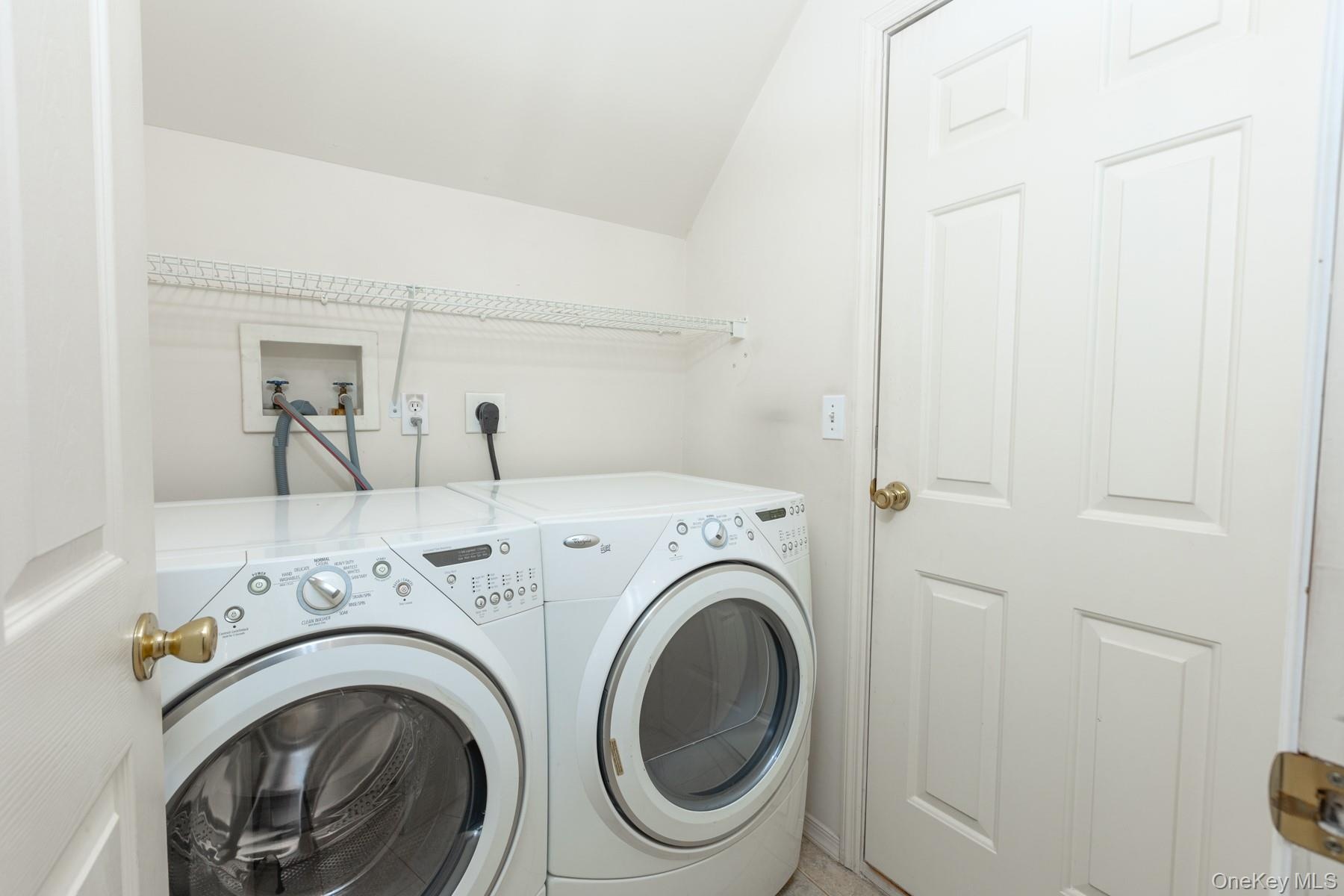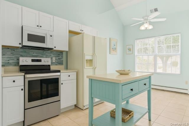 - Kitchen with white appliances, white cabinets, light countertops, light tile patterned floors, and high vaulted ceiling