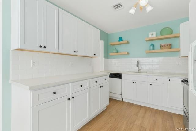 - Kitchen with white cabinets, tasteful backsplash, light wood-style floors, dishwasher, and stainless steel range oven
