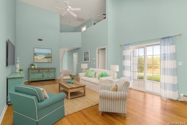 - Living area featuring light wood-style floors, high vaulted ceiling, and a ceiling fan