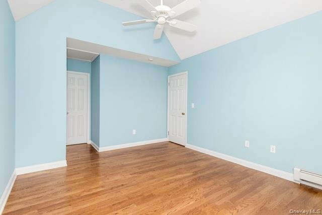 - Empty room featuring light wood-style flooring, vaulted ceiling, and a ceiling fan