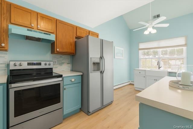 - Kitchen featuring electric range, under cabinet range hood, light countertops, white refrigerator with ice dispenser, and lofted ceiling