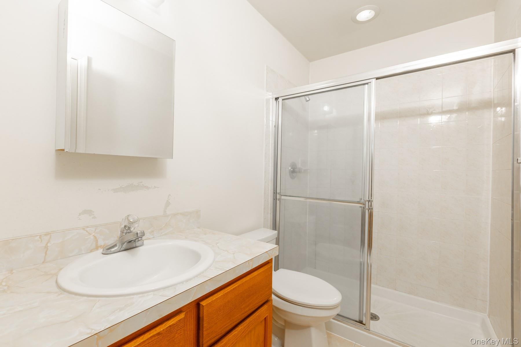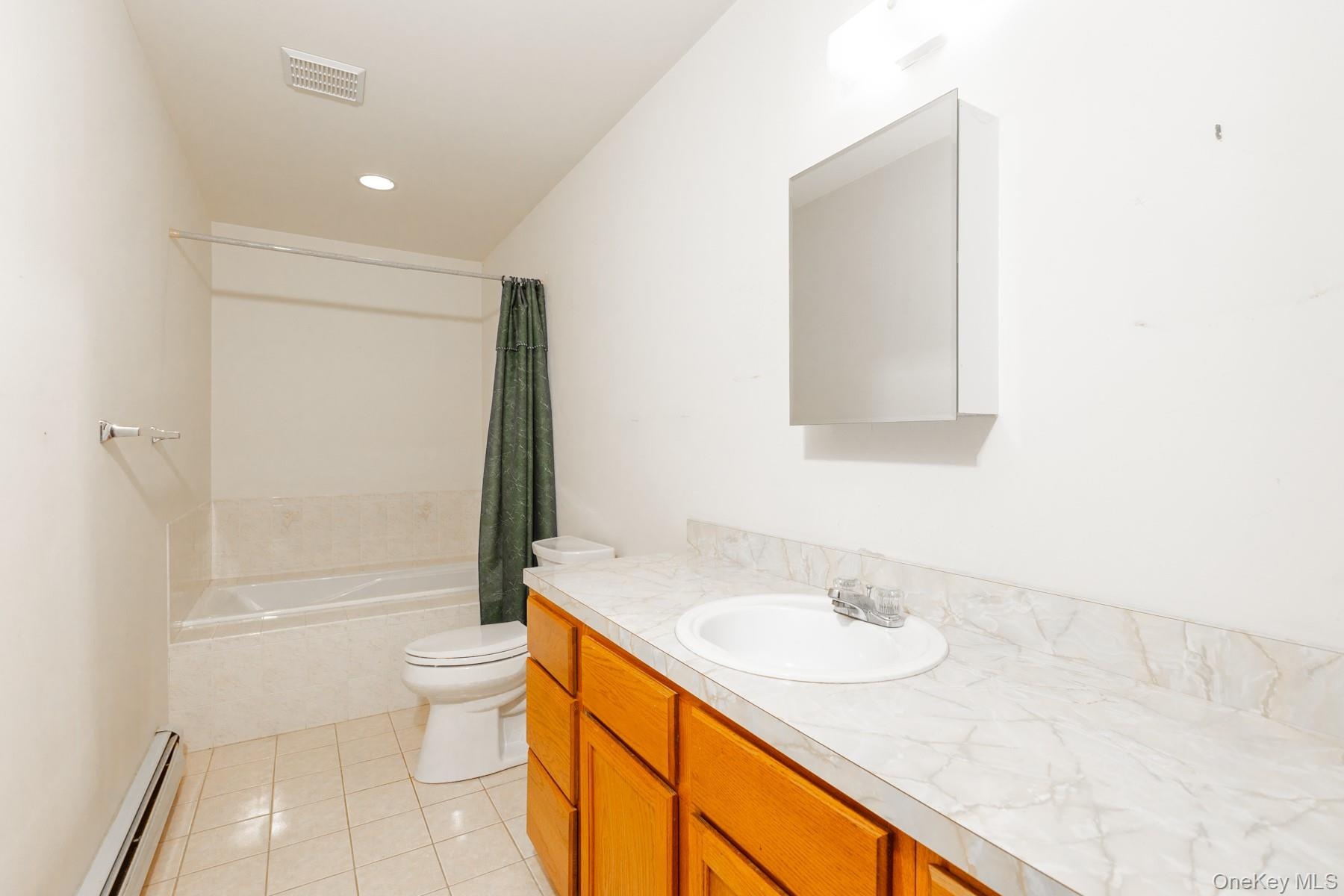 - Bathroom with tile patterned floors, baseboard heating, vanity, recessed lighting, and shower / tub combo