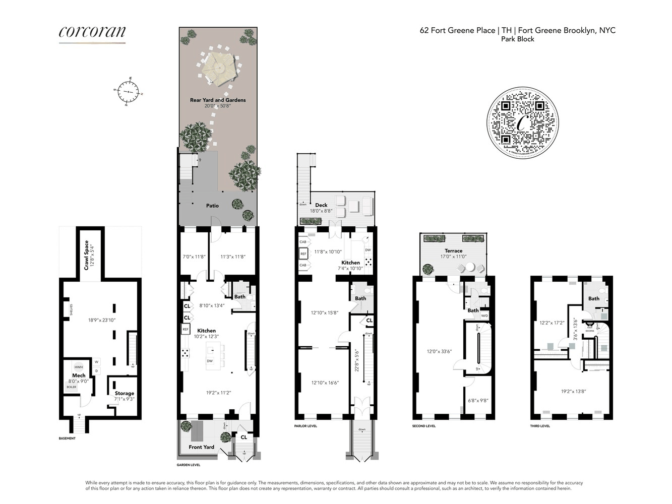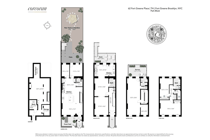 The home lives across multiple levels, with generous rooms, and adaptable layouts that invite retreat and connection. Light moves beautifully throughout-and the space flows in a way that just feels right. The triplex offers elegance and ease. With a graceful parlor floor, and a second-story salon, there's room for quiet moments and large gatherings alike. Upstairs, lofted studios bring in warmth and creativity-exposed brick, tall ceilings, light from above. The kitchen is a quiet standout, dressed in soft gray-blue cabinetry, veined white marble, and steel appliances. All three bathrooms have been redone. Throughout the home: oak inlaid floors, fine millwork, antique pier mirrors, marble mantels, mahogany pocket and patio doors, prominent crown moldings and medallions, skylight apertures, and just enough patina to whisper history. Recessed lighting, central air, and en suite laundry offer up-to-date comfort, while a pair of open-air terraces off the kitchen and second floor add layers of outdoor living. The garden unit has the feel of being an intimate, open, and stylistically contemporary loft. More than that, it has enough storage and a focal point island. A dining area and a full bathroom complete the floor, with two additional rooms leading out to the patio and a deep, divinely verdant yard.
