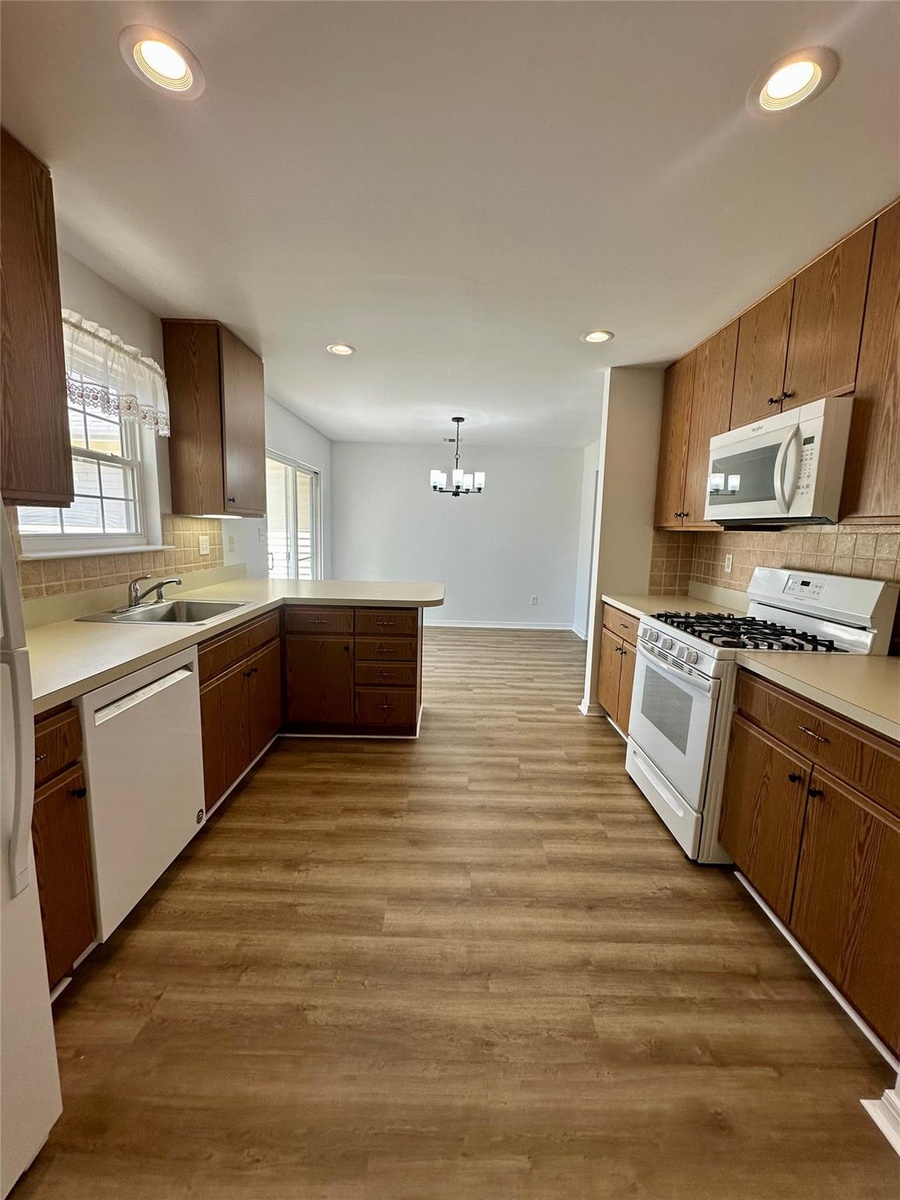 - Kitchen featuring microwave, oven, and cooking range. View into formal dining area.