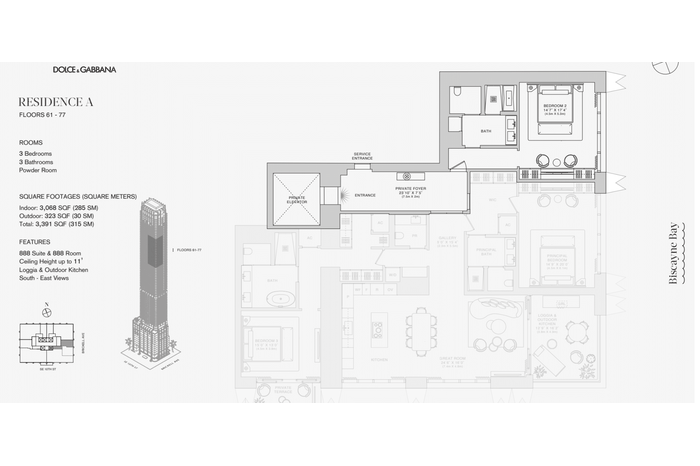 Inside the residence, every detail carries the unmistakable hand of Dolce&Gabbana Casa. Owners may choose from four distinct interior palettes that range from bold and sculptural to soft and refined. Materials include Travertino Giallo, Covelano Macchia Vecchia, and Sahara Noir marble, paired with custom millwork, couture hardware, and meticulously built wardrobes. The kitchen is executed with a level of integration and craftsmanship that feels more architectural than decorative, and the bedrooms are designed as elegant suites with spa-quality baths and tailored storage. Sliding window walls extend the living experience outward, creating a continuous connection between interior space and the Miami skyline.