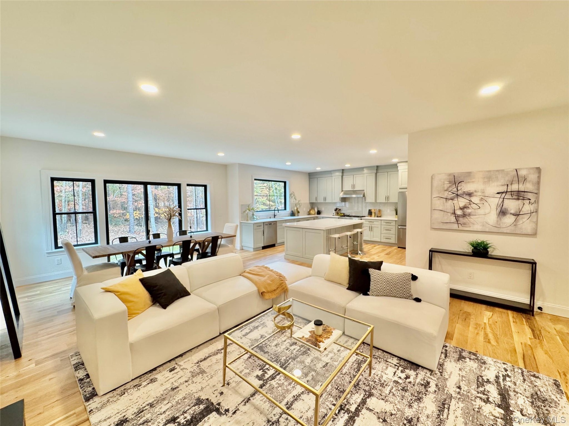 - Additional living space featuring light wood-style floors, recessed lighting, and high vaulted ceiling