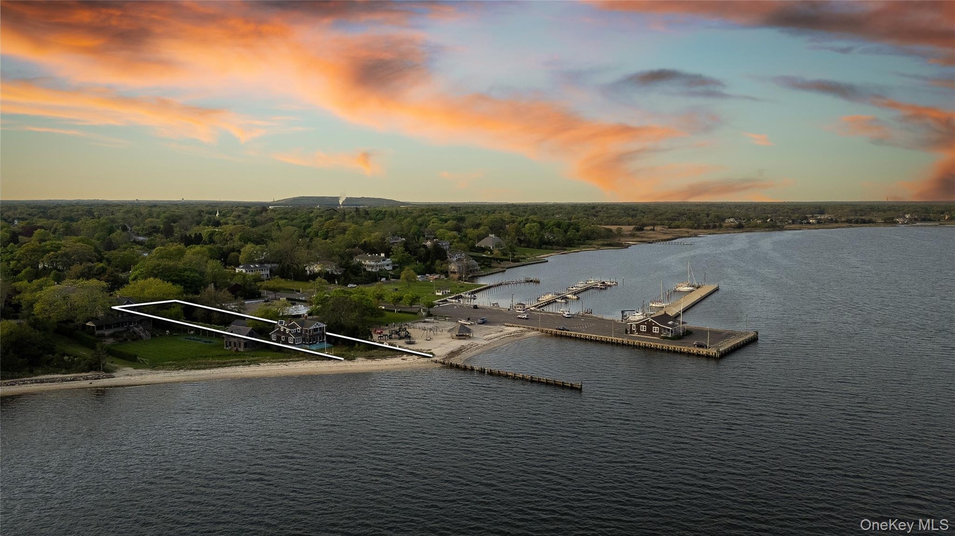 - Aerial view at dusk of a water view, property boundaries highlighted, and a forest view
