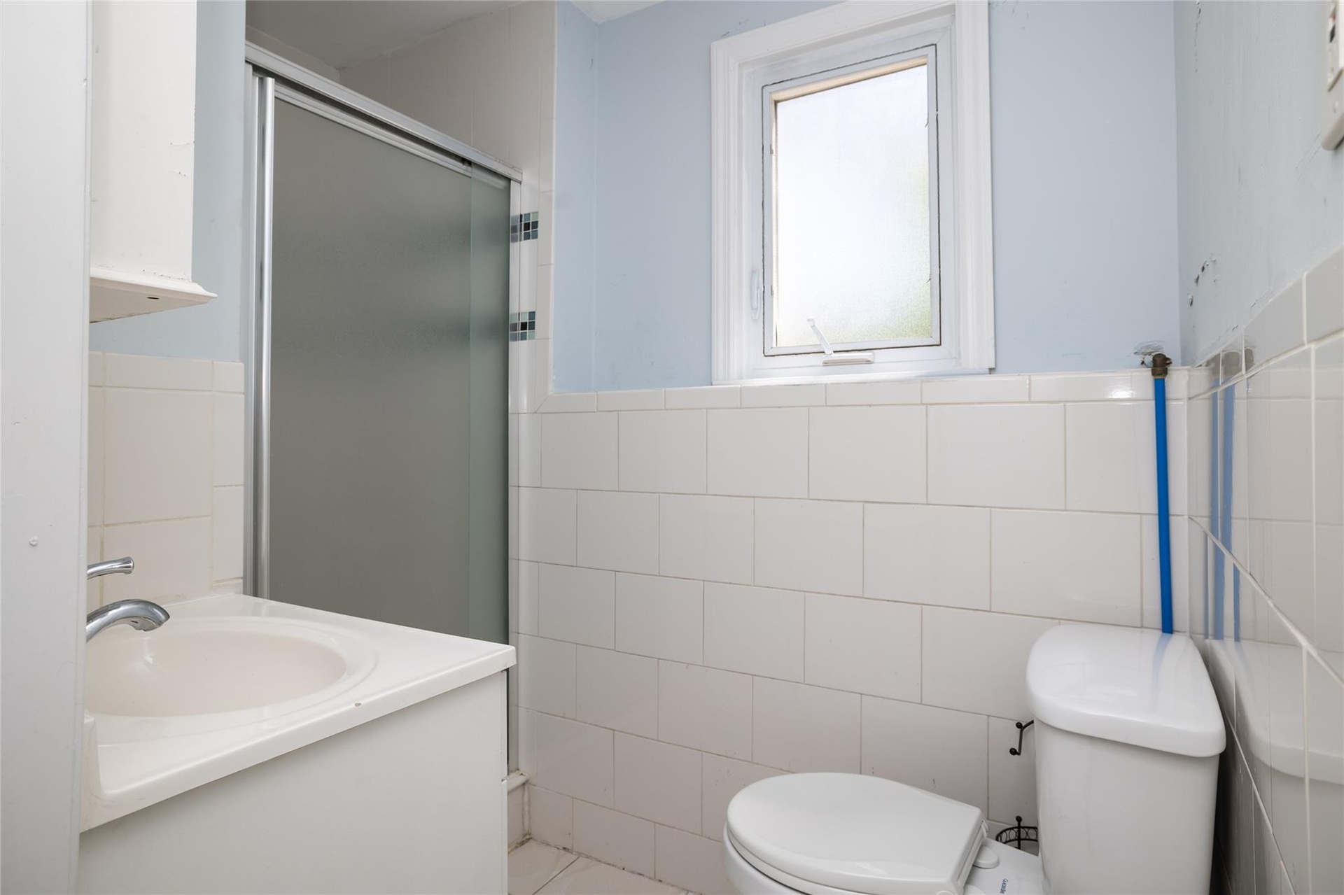 - Bathroom with tile walls, toilet, a stall shower, wainscoting, and vanity