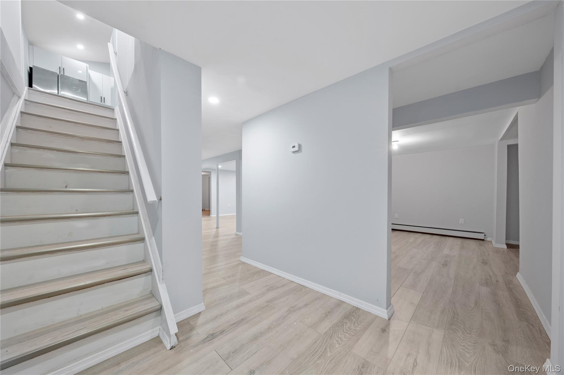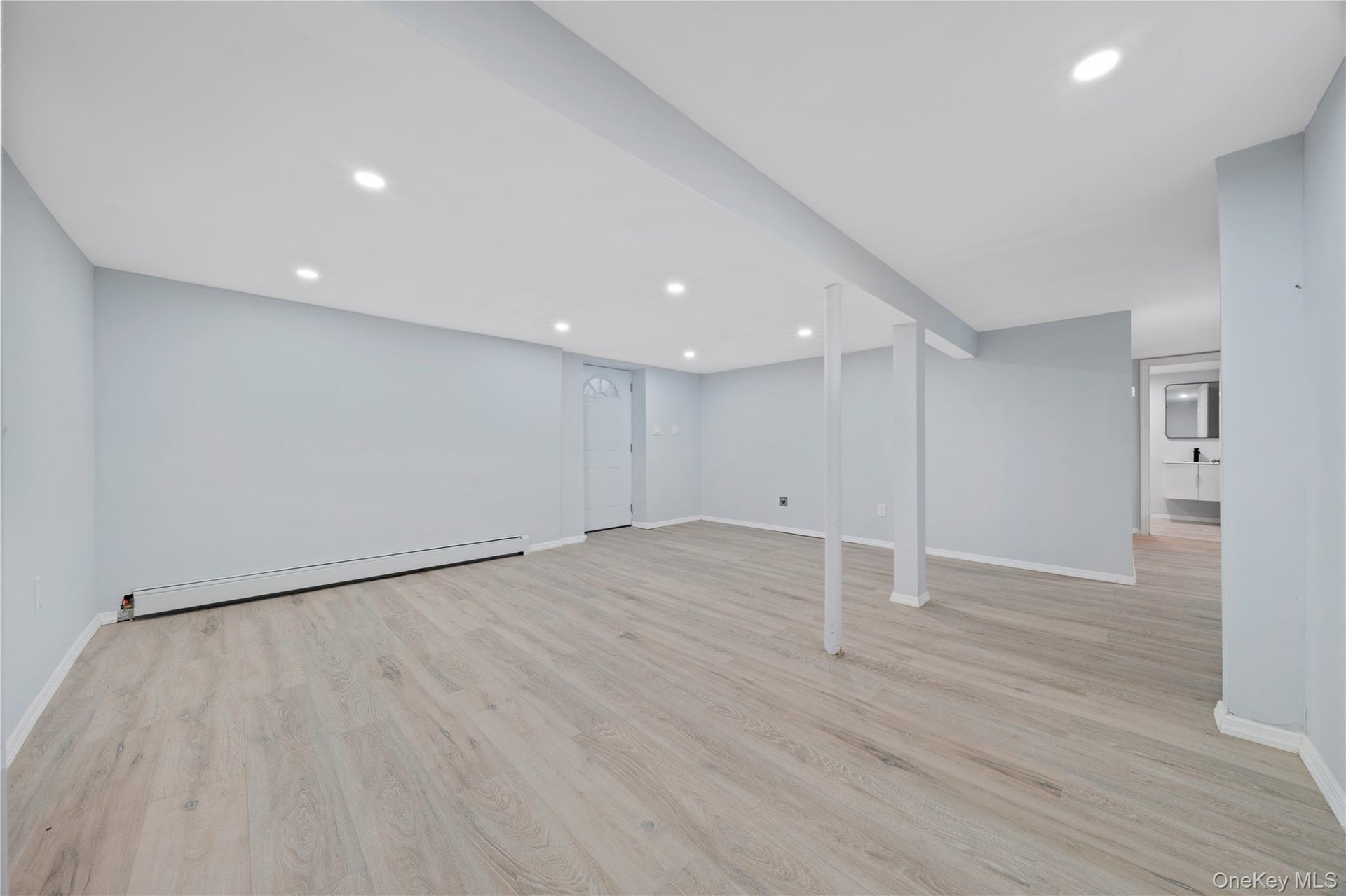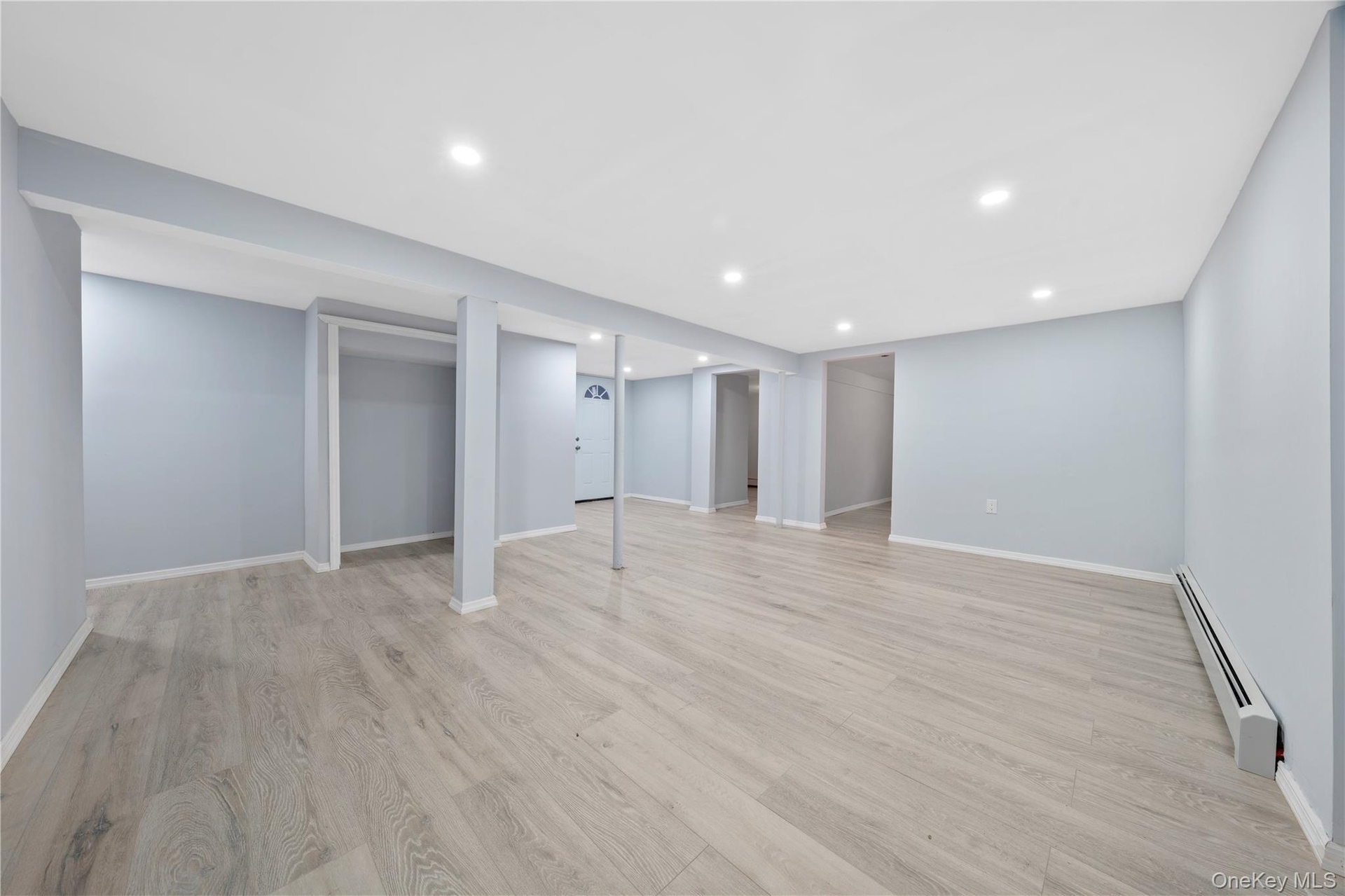 - Finished below grade area with baseboard heating, recessed lighting, light wood-style floors, and baseboards