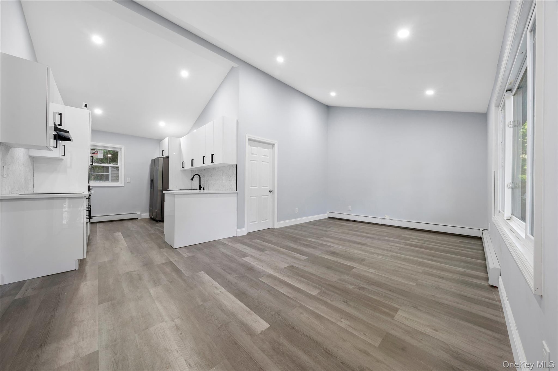 - Unfurnished living room with a sink, lofted ceiling, a baseboard radiator, wood finished floors, and baseboards