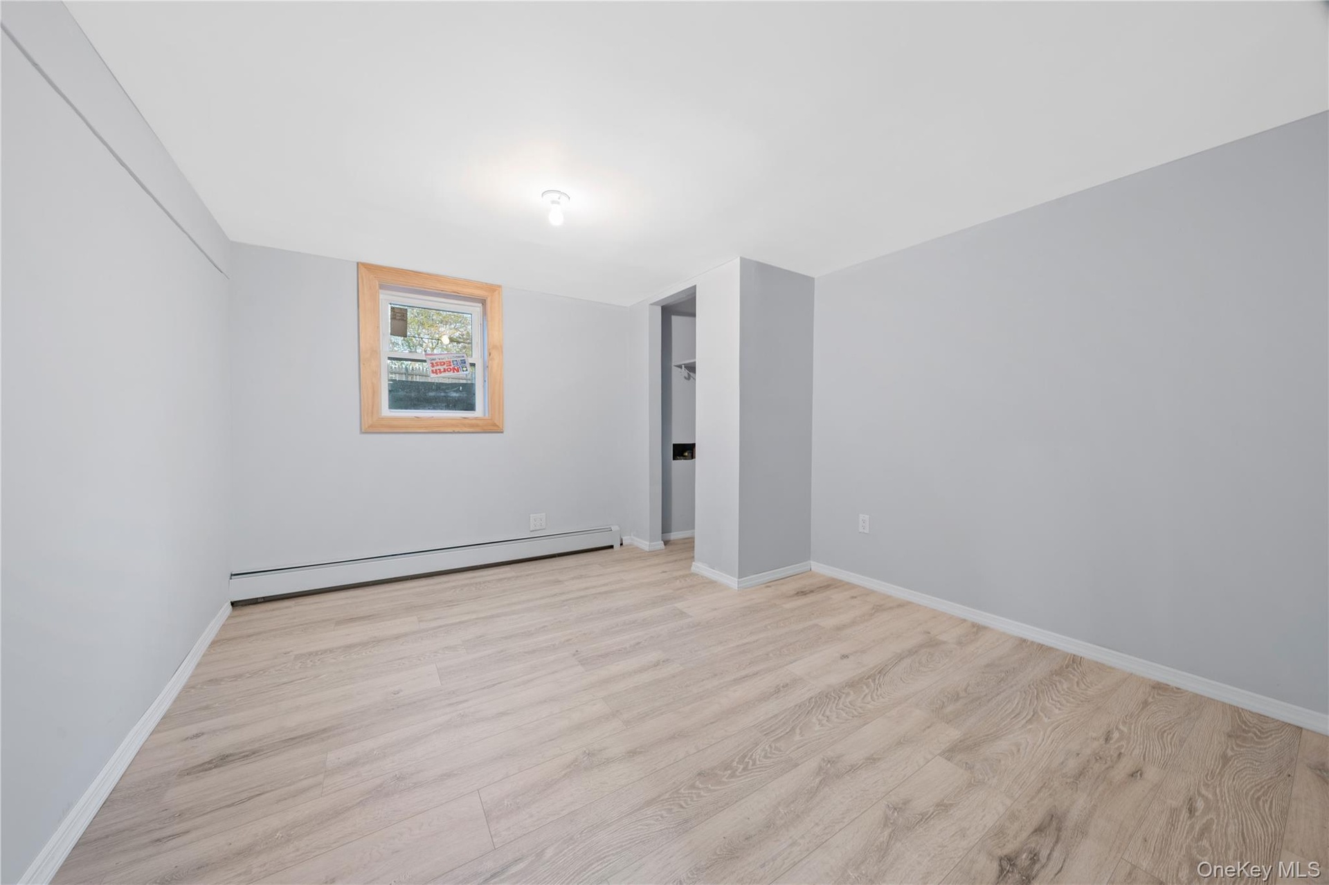 - Empty room with a baseboard radiator, wood finished floors, and baseboards