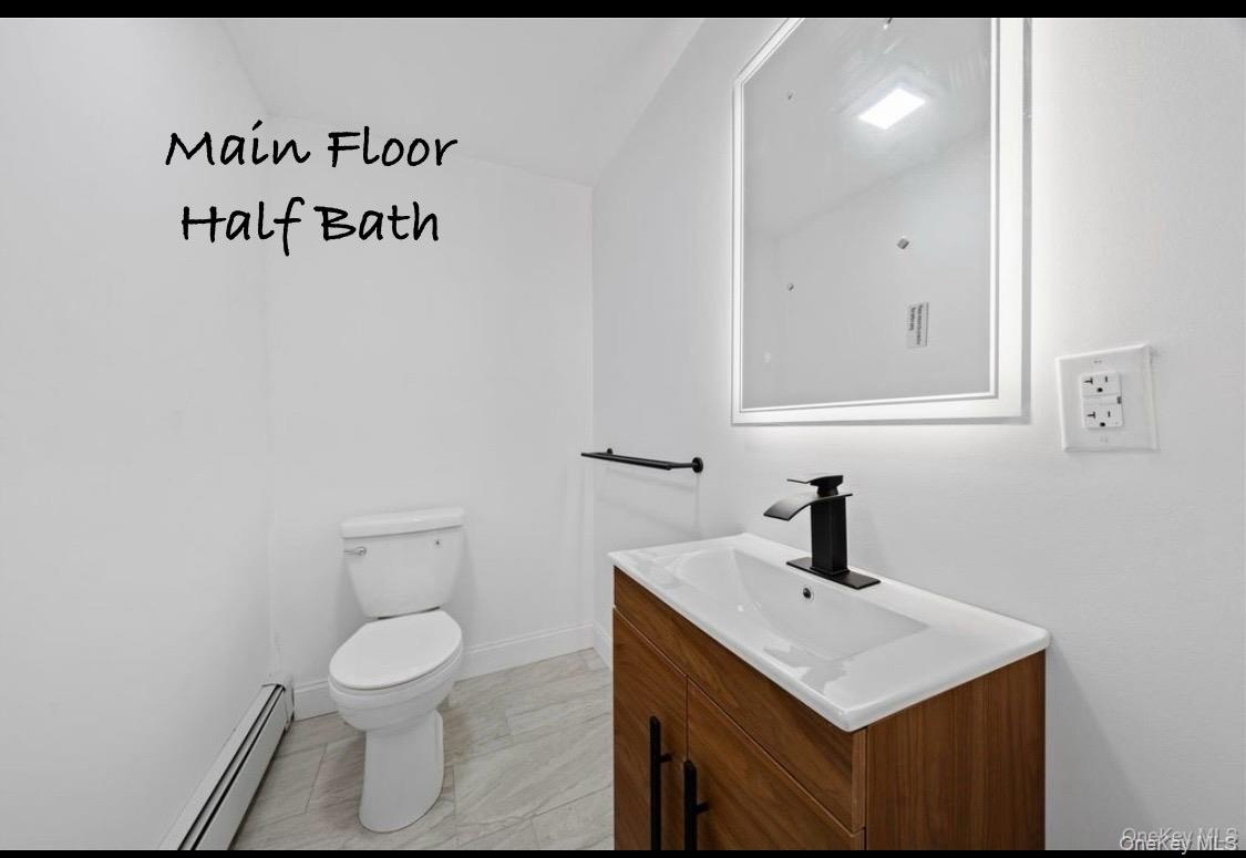 - Half bath featuring baseboard heating and vanity