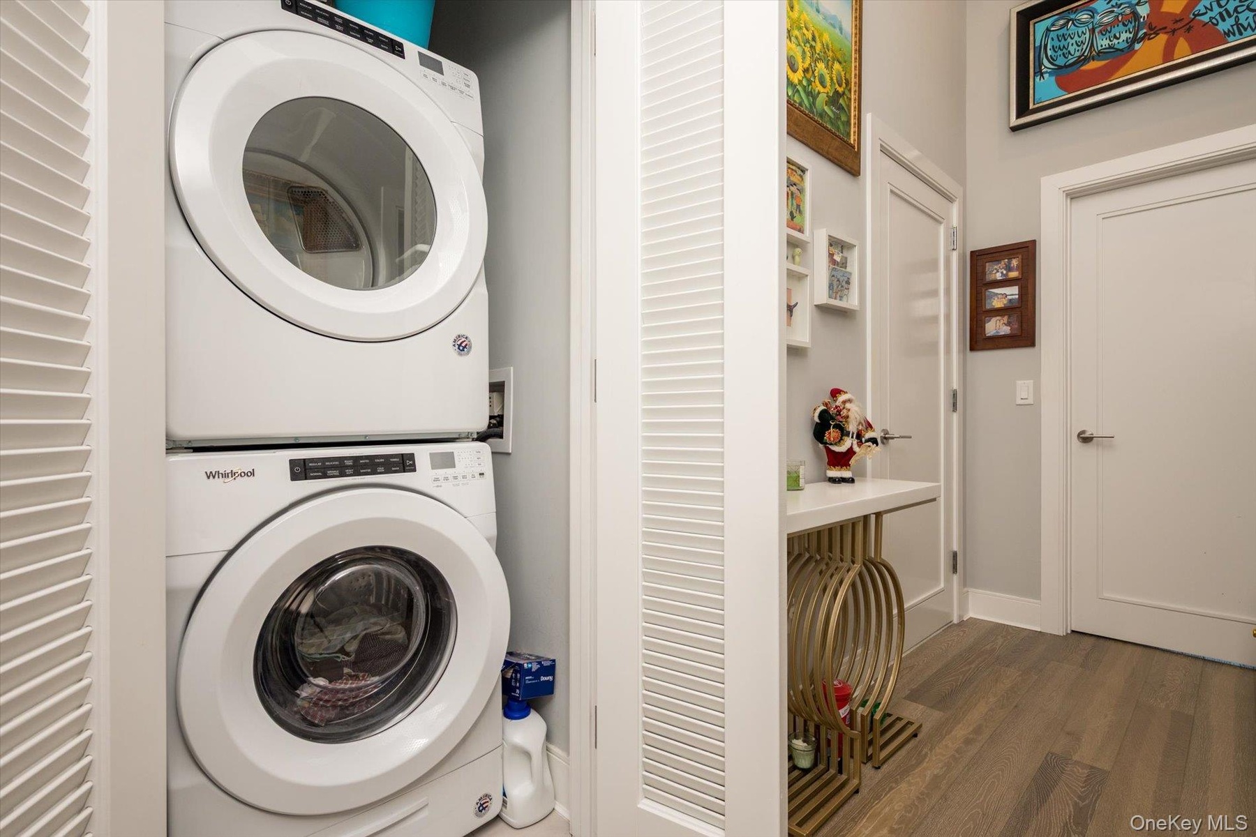 - Washroom with stacked washer / dryer, wood finished floors, and baseboards