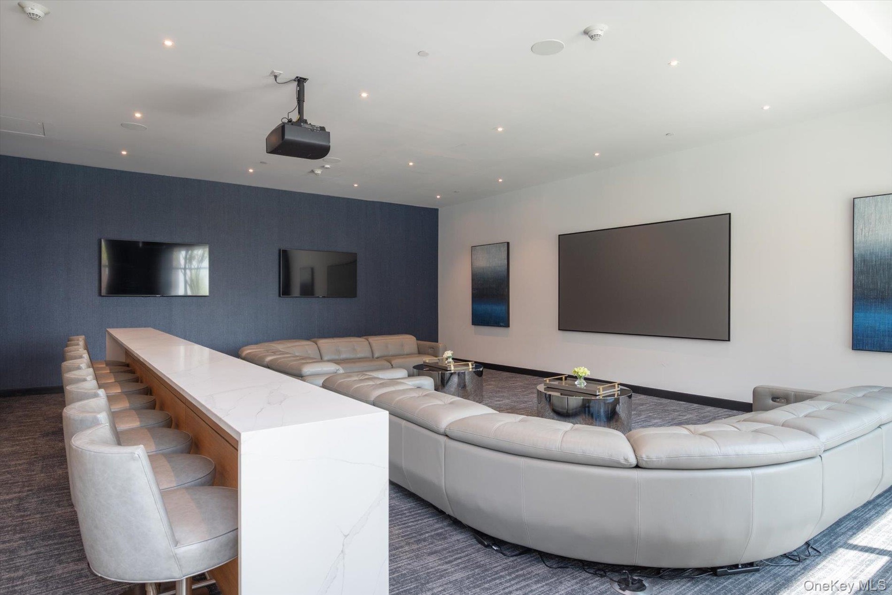 - Home theater room with an accent wall, recessed lighting, and baseboards