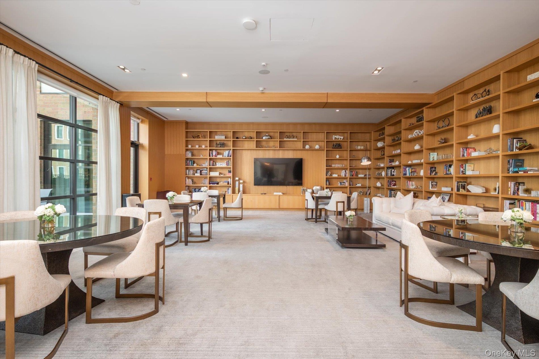 - Living room with built in shelves and carpet
