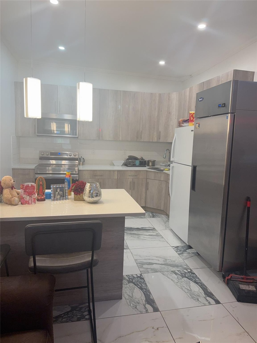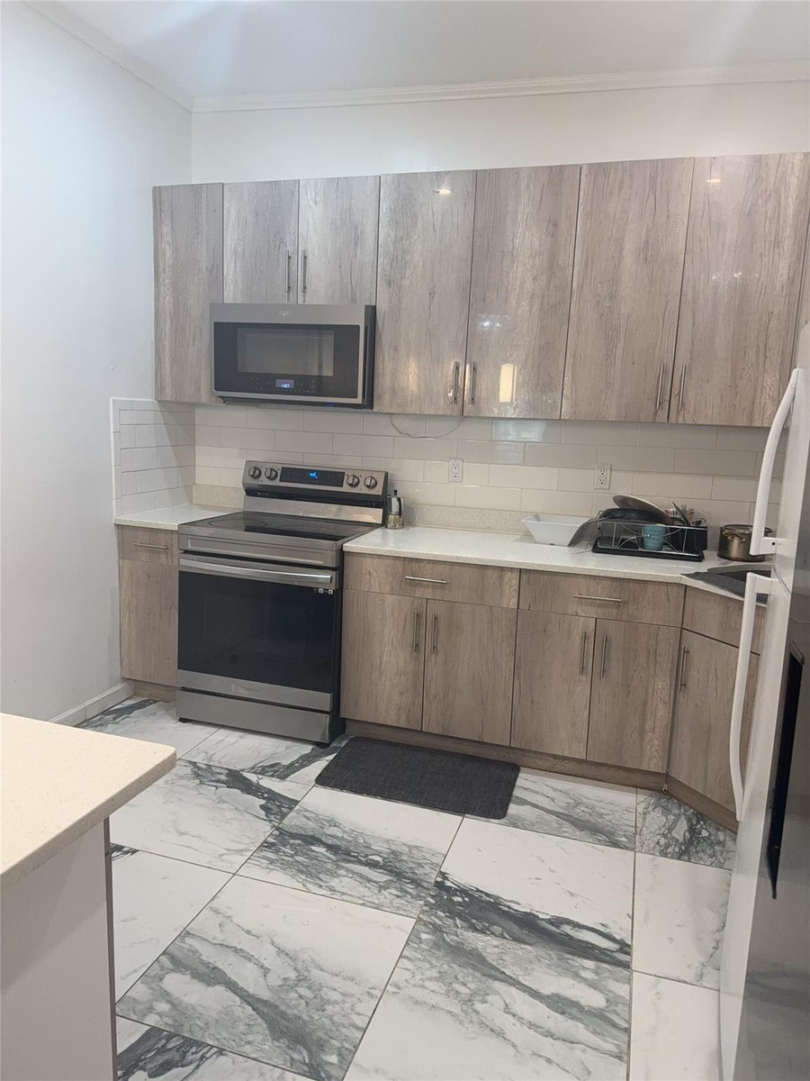 - Kitchen featuring appliances with stainless steel finishes, backsplash, light countertops, crown molding, and light marble finish floors