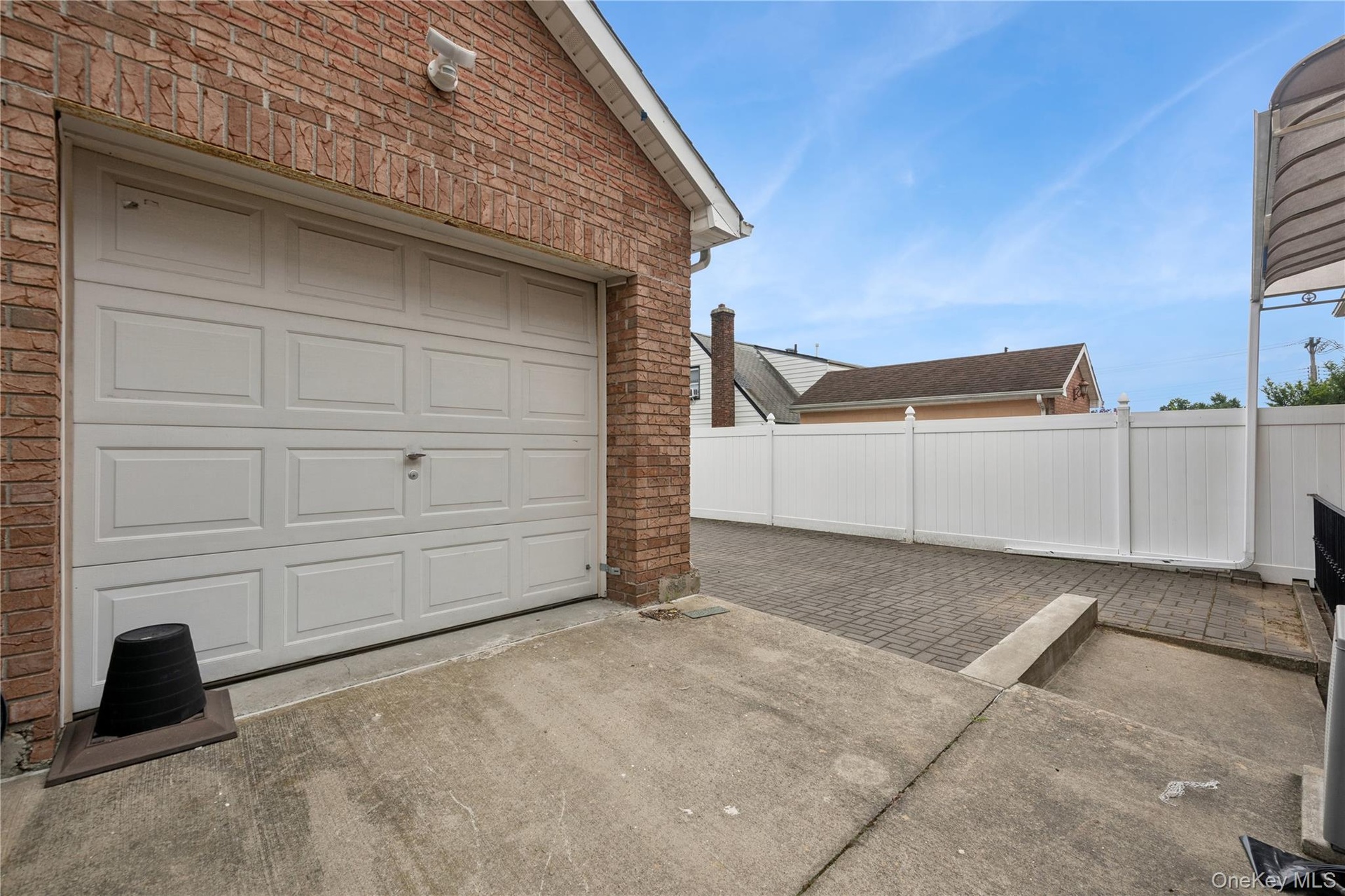 - Garage featuring concrete driveway and fence