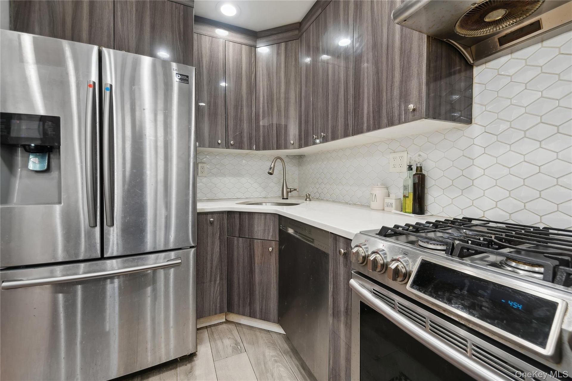 - Kitchen featuring stainless steel appliances, extractor fan, dark brown cabinetry, light countertops, and backsplash