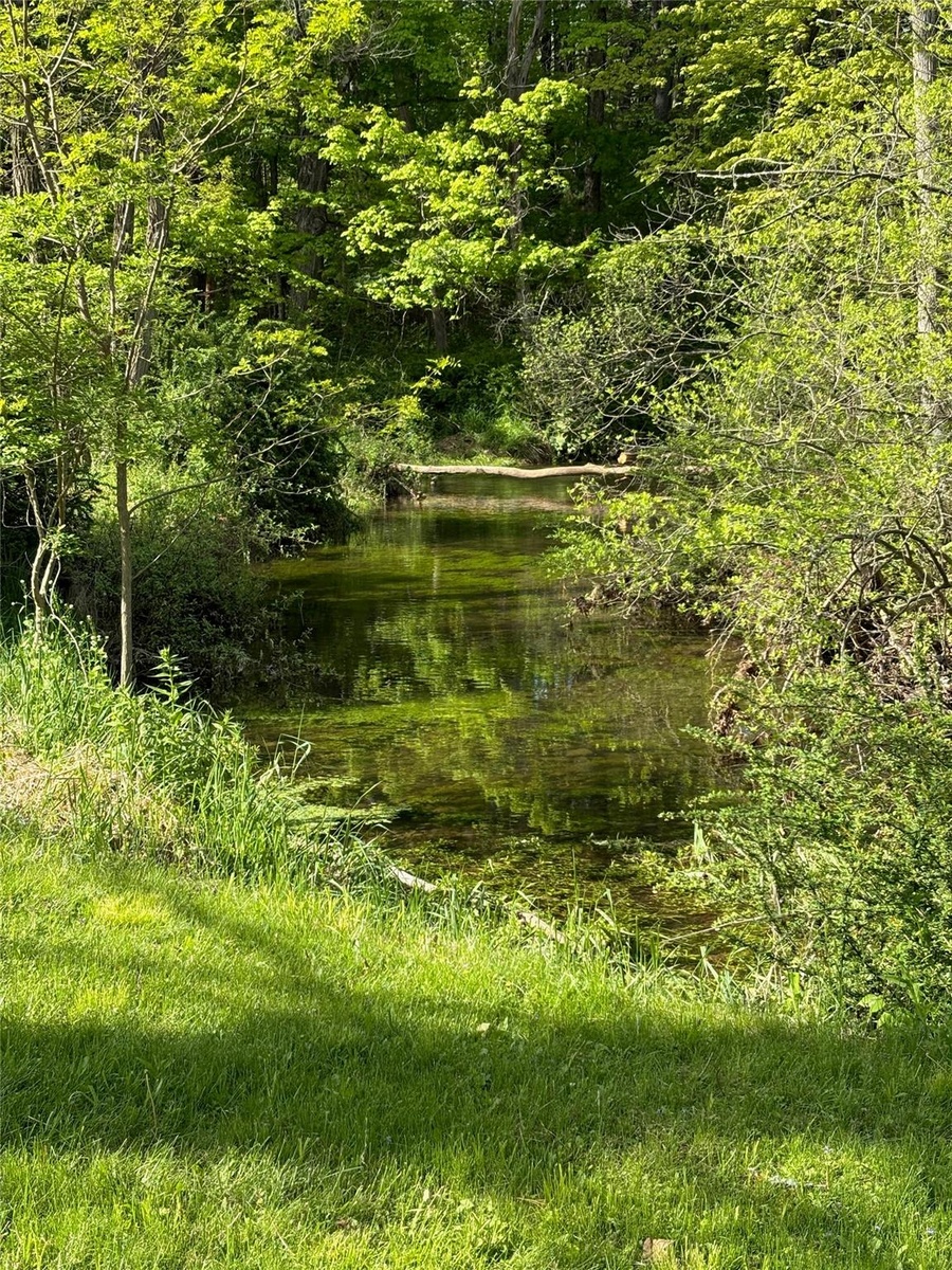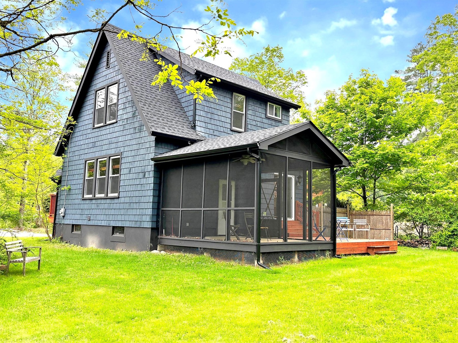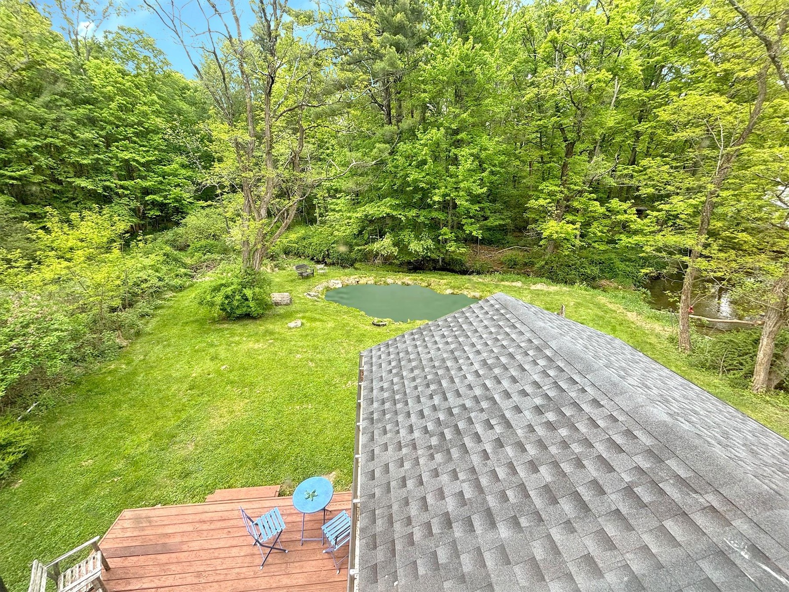 Country charm -- less than a mile from the Woodstock Village Green! A stream meanders by the massive screened porch and deck. There are also views of your own pond while you enjoy dining al fresco just outside the sliding glass kitchen door. This house transports you to a light, airy, simpler lifestyle. The kitchen opens to a gracious dining room (with a breakfast bar and additional kitchen cabinetry) making entertaining both inside or outside a snap. The Living Room is oversized and anchored by a large corner fireplace. The rounded red door of this unique cape style home (c.1950) ushers you through an adorable foyer and weather lock. Upstairs is a lovely, large bathroom with a herringbone tile shower/tub enclosure and a swinging glass door. There are also two large bedrooms with ample closets and plenty of room for a desk or in-home office. This is a magical spot that is basically right in town, yet it feels like you are remote. The house is tucked behind 2 other homes separating it from the road, and it backs up to 2 streams and some calming woods. This half acre leaves room for a stream-side fire pit, a garden, a place to play croquet, or a place to relax and lounge in the sun. A full basement with laundry adds to the comfort and storage options. Easy-peasy as you are on the NYC bus line and can jump out right in front of your driveway. Or drive up (under 2 hours from NYC) or your leave a car in the driveway that supports 4 or 5 cars. This is a place to enjoy the many delicious restaurants, shopping, and proximity to hiking, skiing, and everything the Catskills has to offer! Get comfortable in this ''move in and relax'' situation!