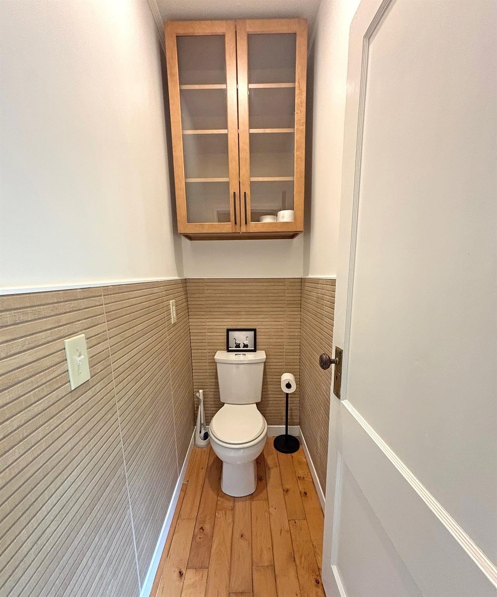 - Bathroom featuring toilet, wainscoting, hardwood / wood-style flooring, and tile walls