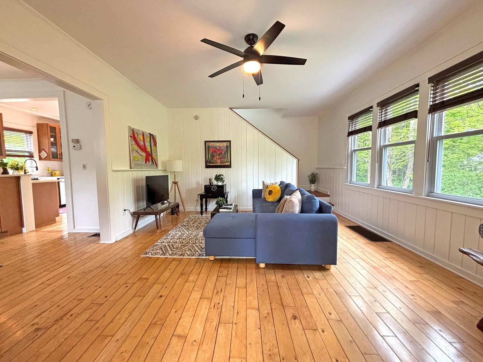 - Living area with ceiling fan, light wood-style flooring, a wainscoted wall, and wooden walls