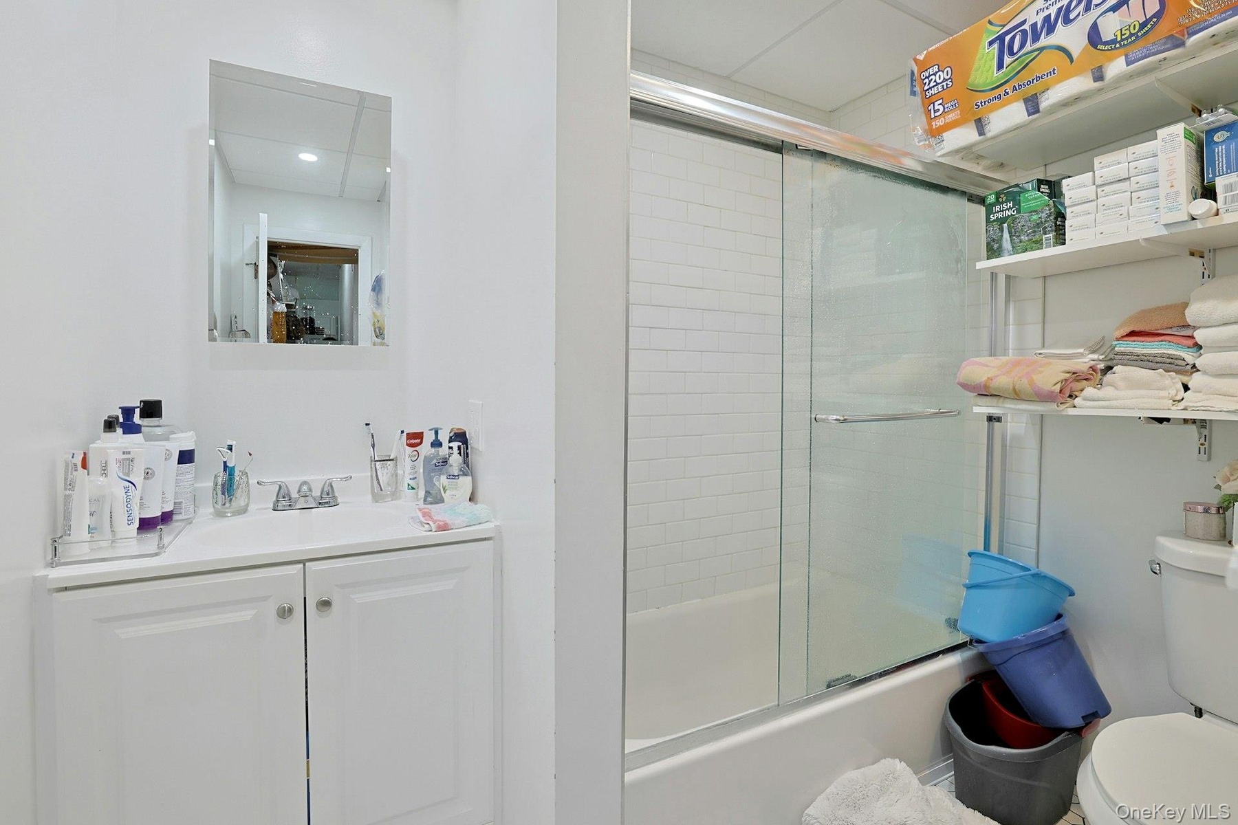 - Bathroom featuring toilet, vanity, combined bath / shower with glass door, and recessed lighting