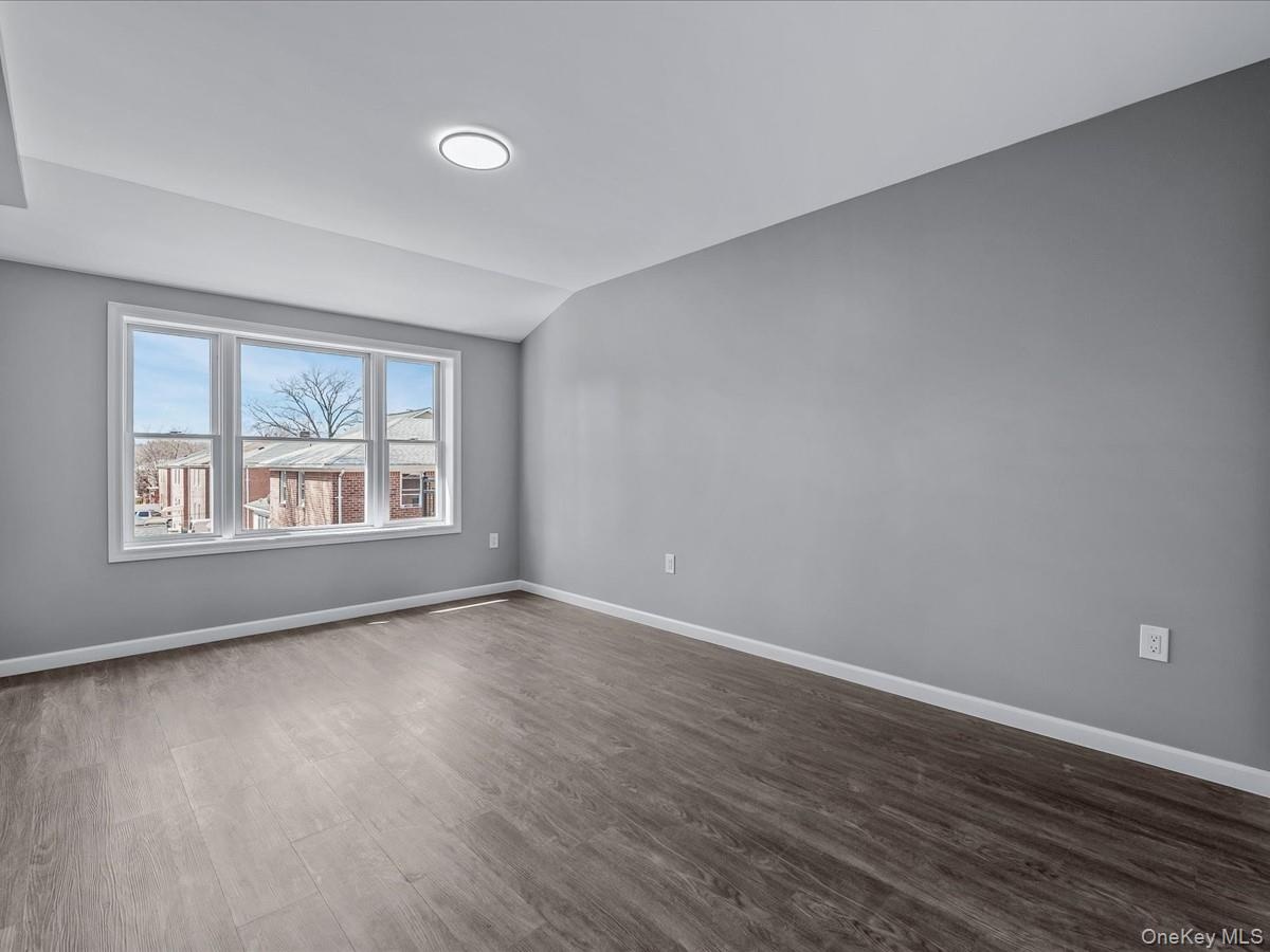 - Empty room with dark wood finished floors, baseboards, and lofted ceiling