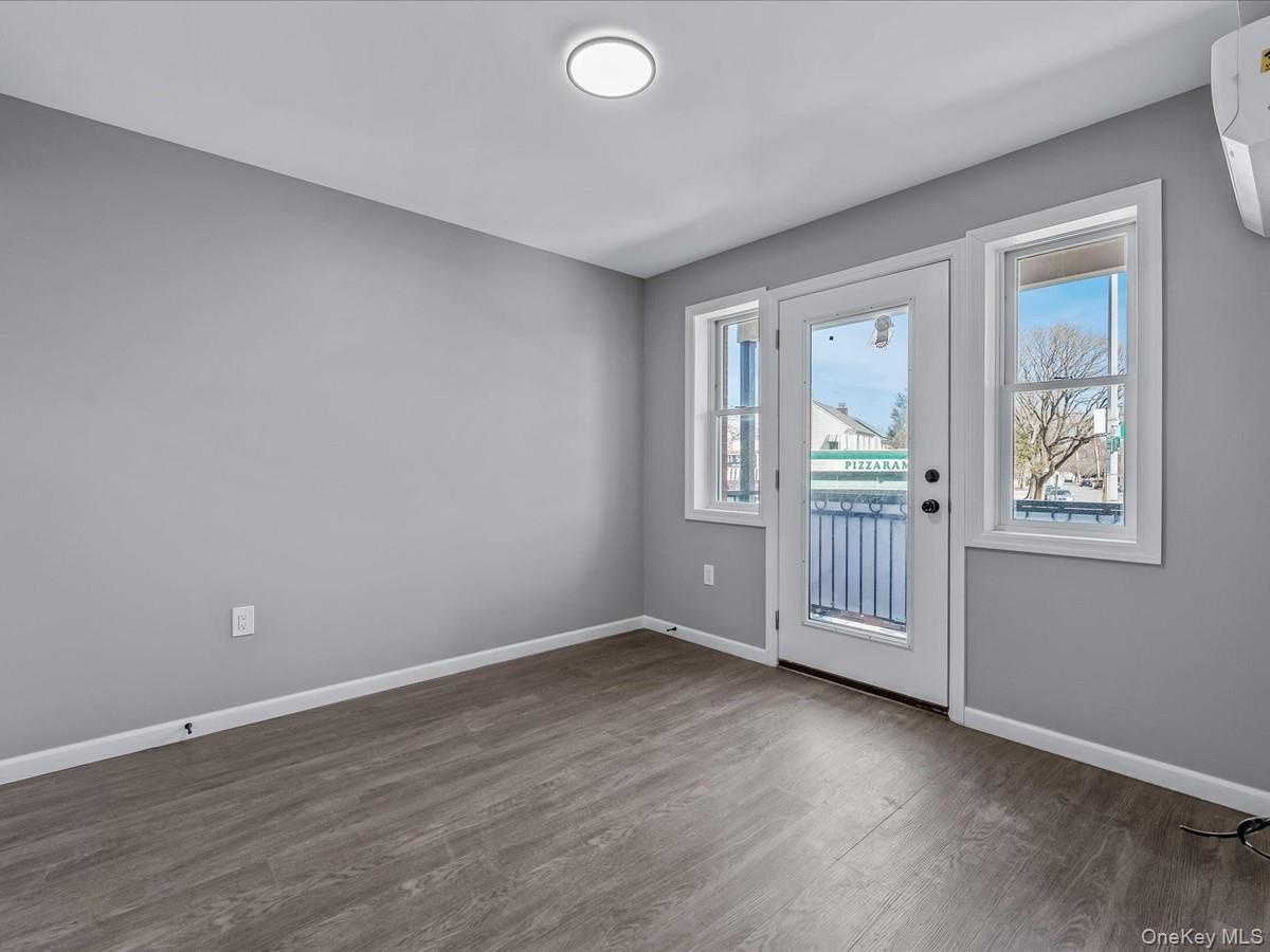 - Empty room with plenty of natural light, dark wood-style flooring, baseboards, and a wall unit AC