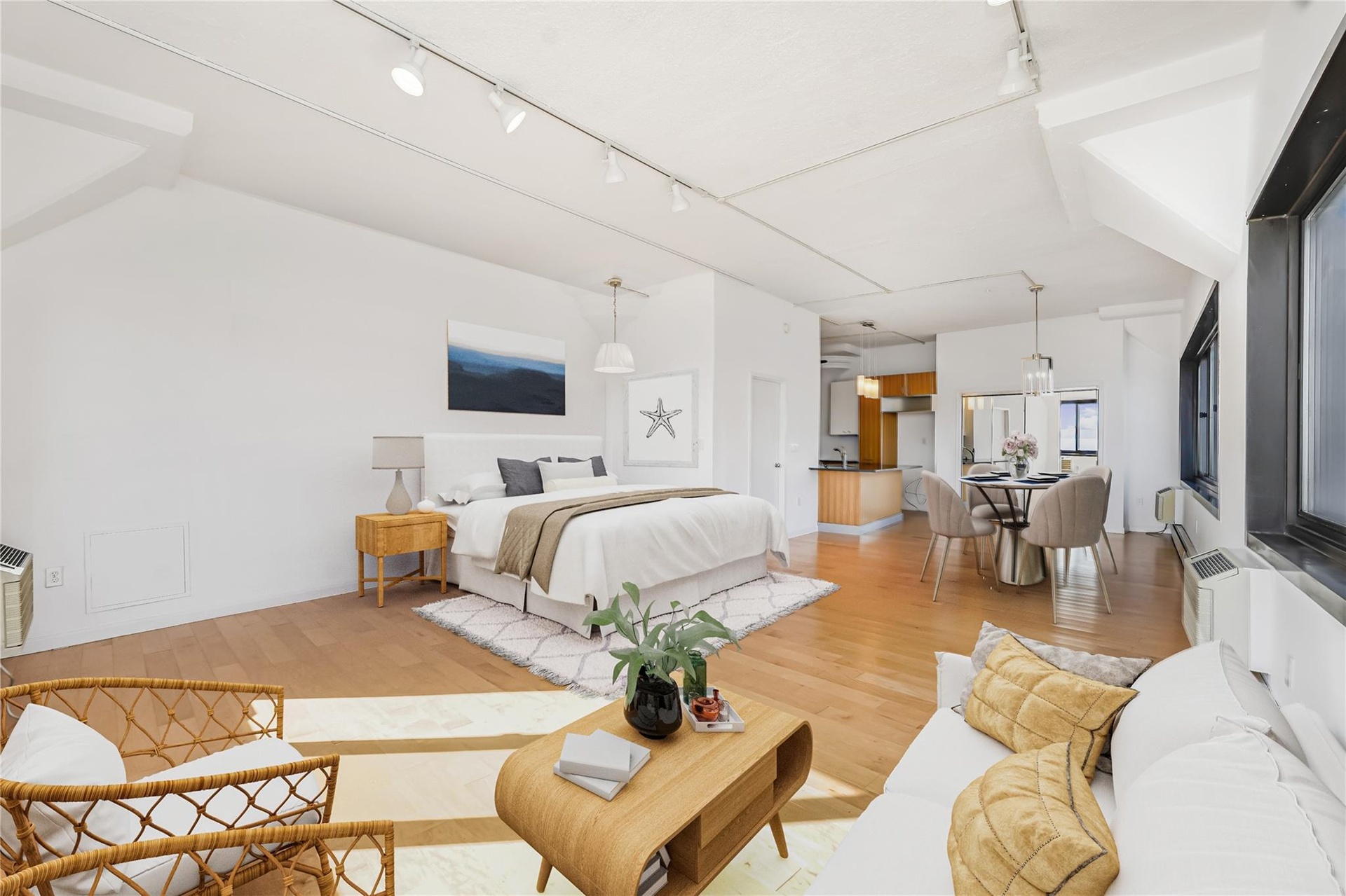 - Bedroom featuring baseboard heating, wood finished floors, and track lighting