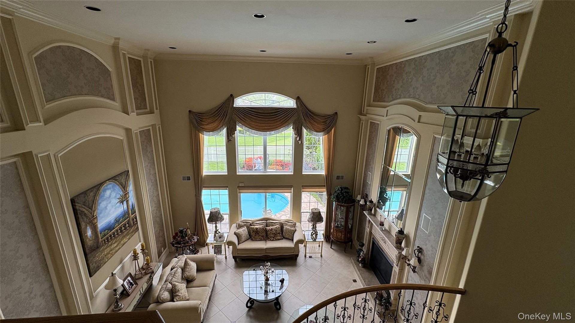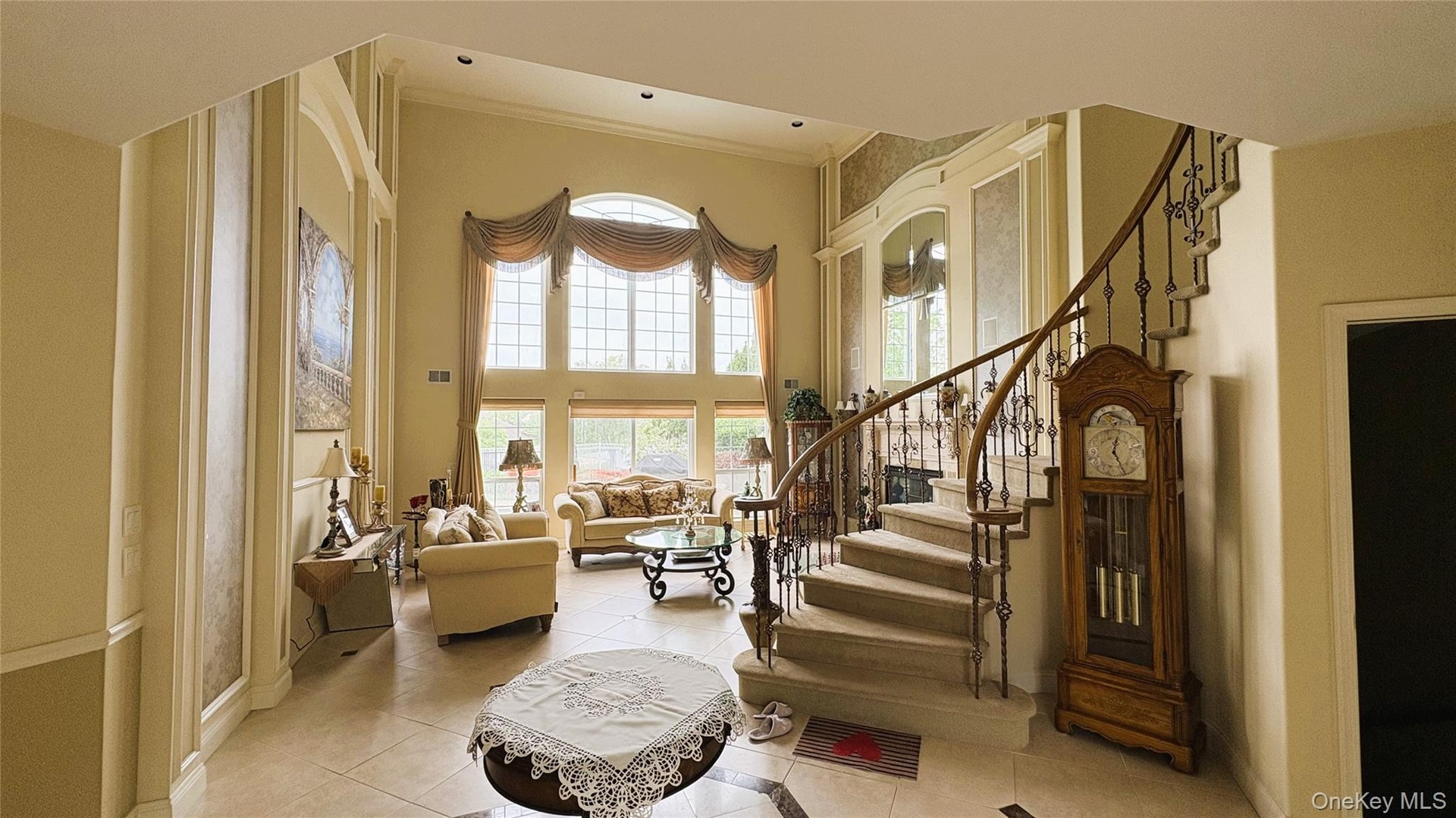 - Living room with a high ceiling, light tile patterned flooring, and crown molding