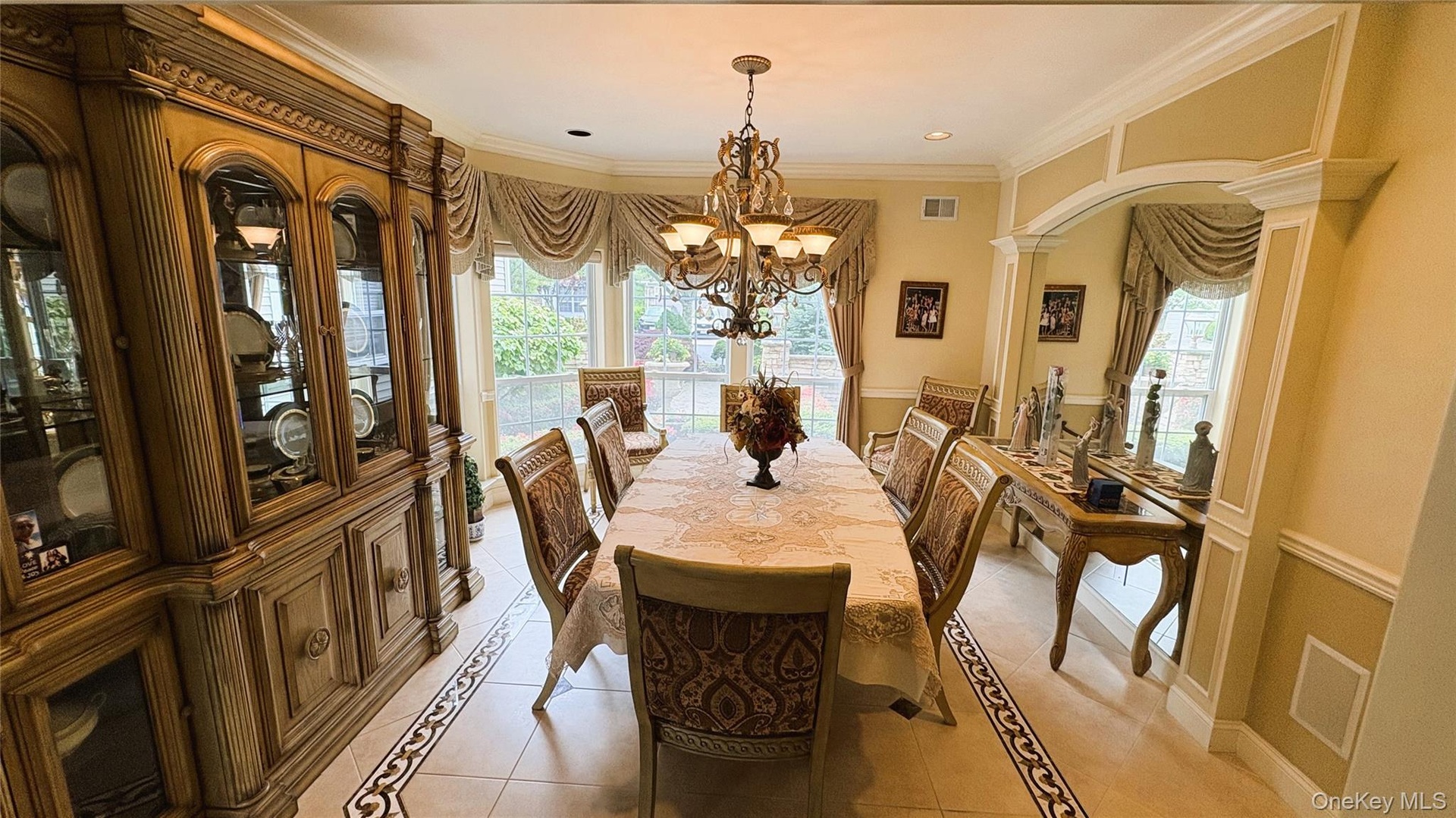 - Dining area with inlaid floor details, a chandelier, light tile patterned floors, crown molding, and ornate columns