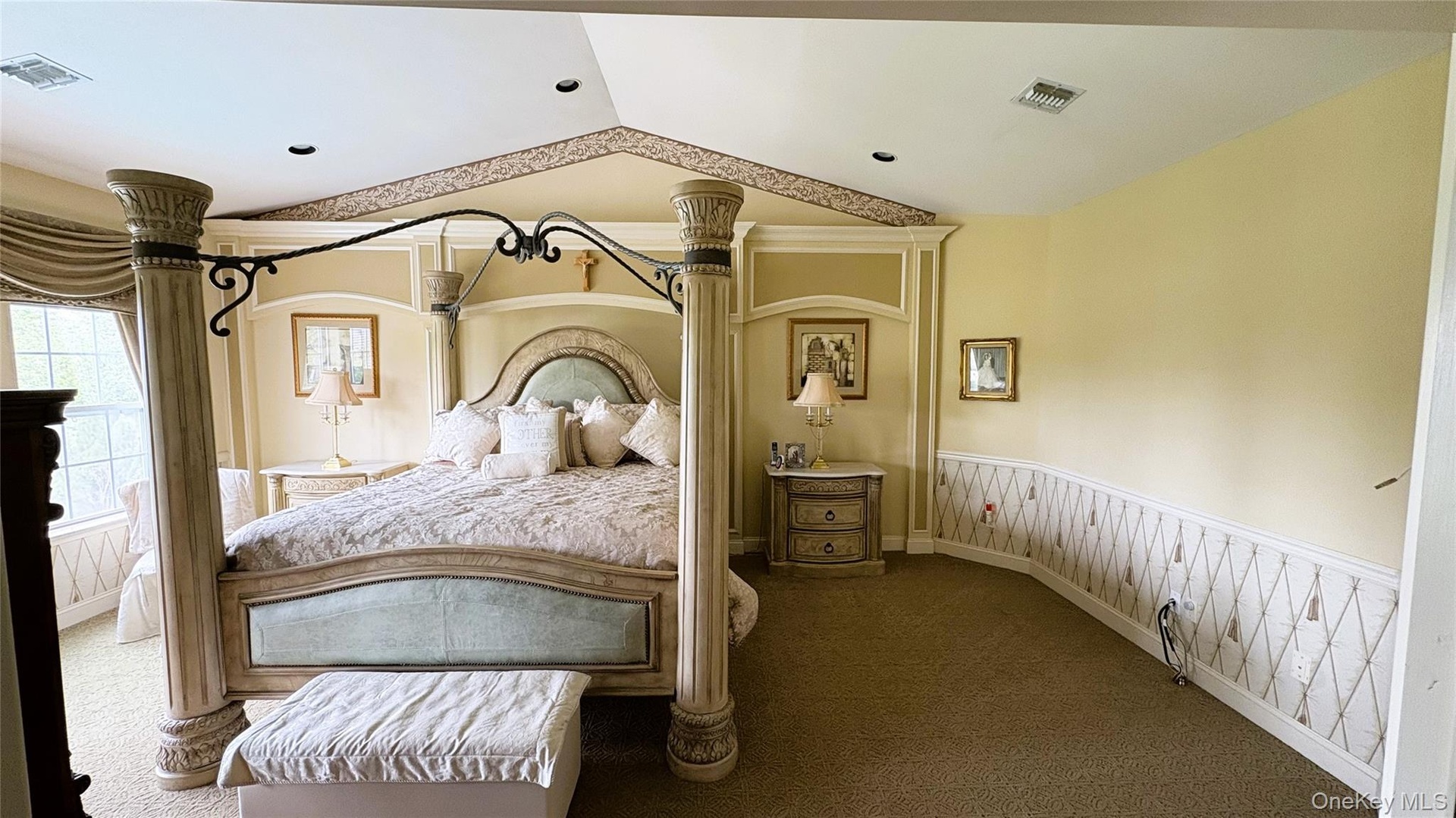 - Bedroom with carpet floors and lofted ceiling