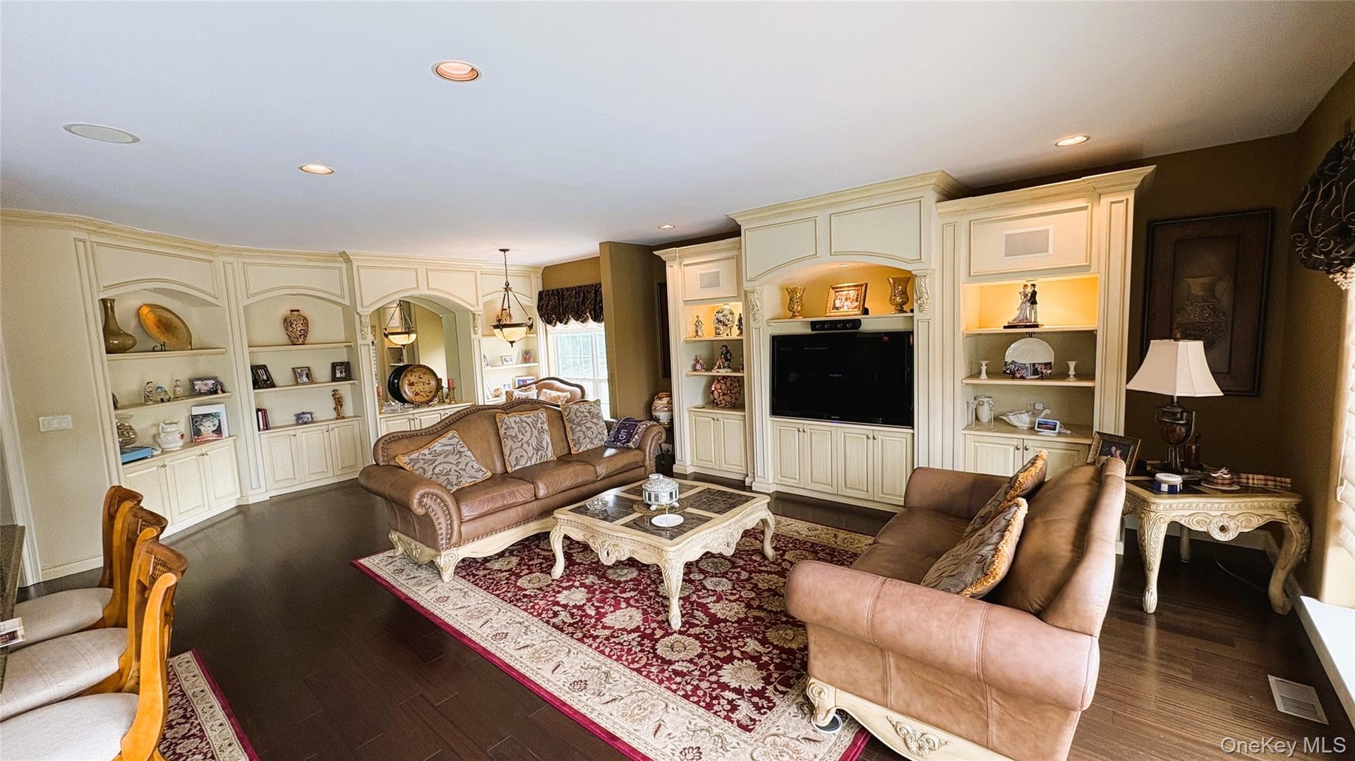 - Living room with wood finished floors, recessed lighting, and built in features