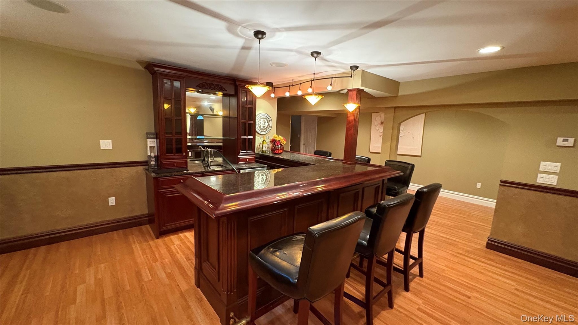- Indoor dry bar with light wood-style flooring, pendant lighting, baseboards, arched walkways, and recessed lighting