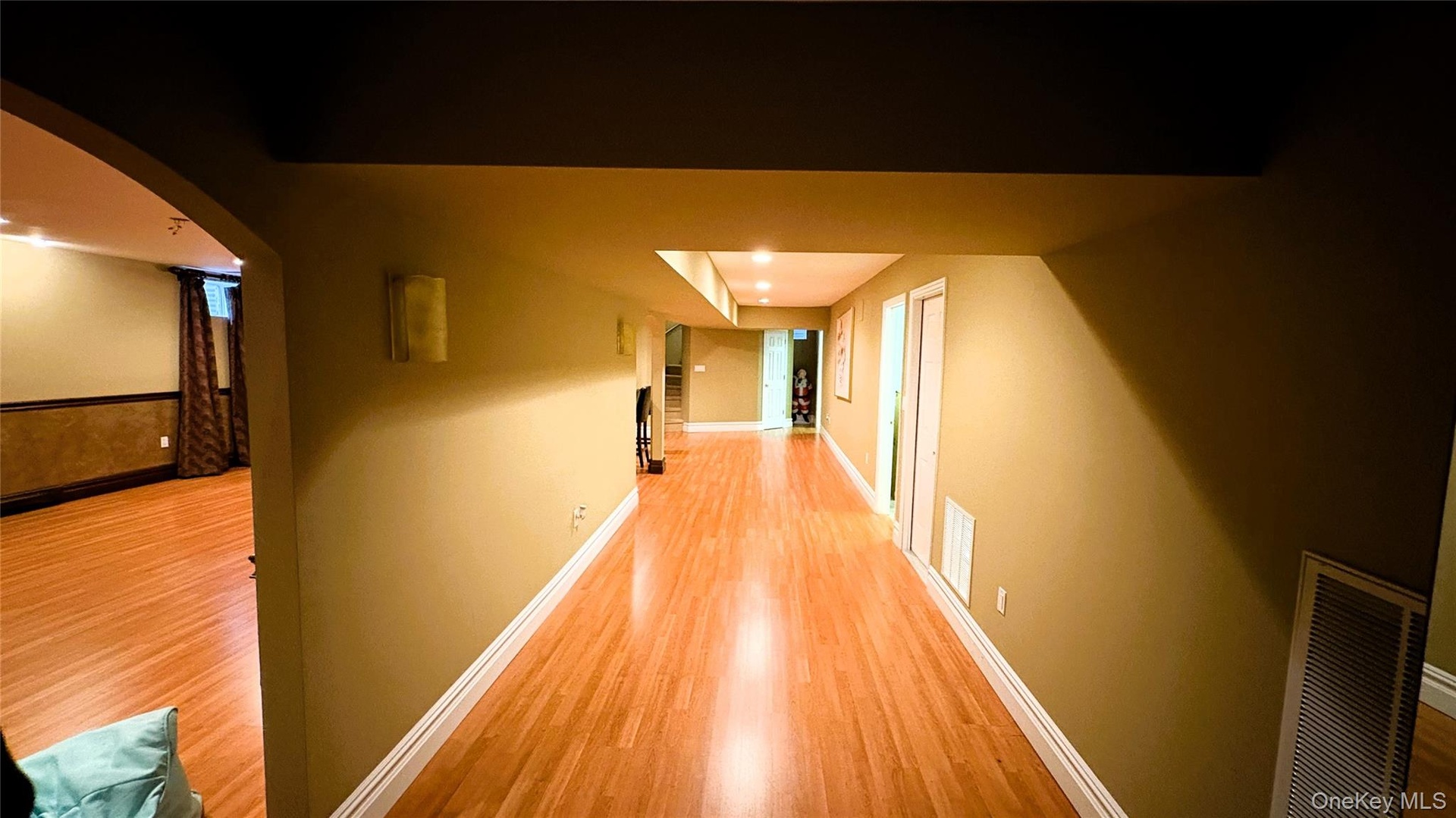 - Hallway featuring light wood-type flooring, baseboards, and arched walkways