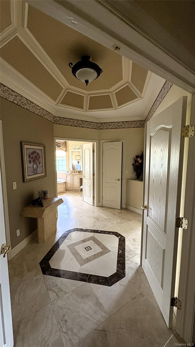 - Entrance foyer with baseboards, inlaid floor details, and ornamental molding