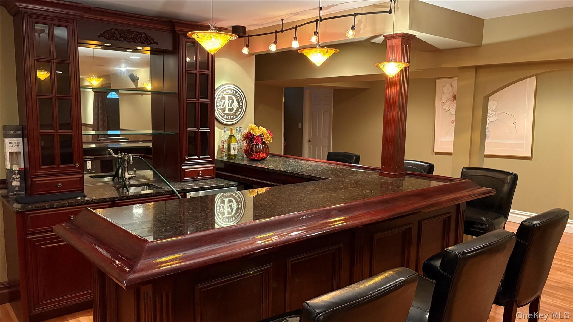 - Community bar area with ornate columns, light wood-style flooring, hanging light fixtures, and rail lighting