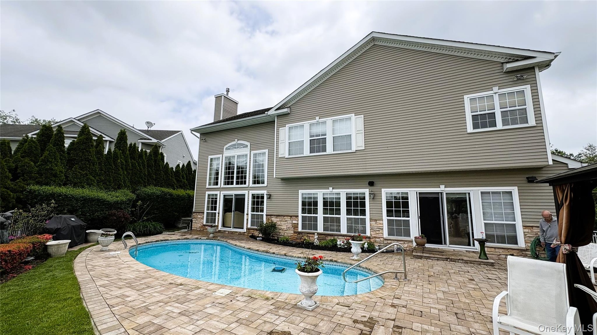 - Rear view of house with a patio, a chimney, an outdoor pool, and stone siding
