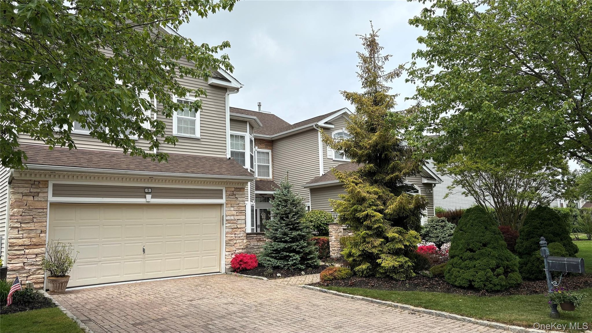 - View of front of property featuring stone siding, a garage, a chimney, decorative driveway, and roof with shingles