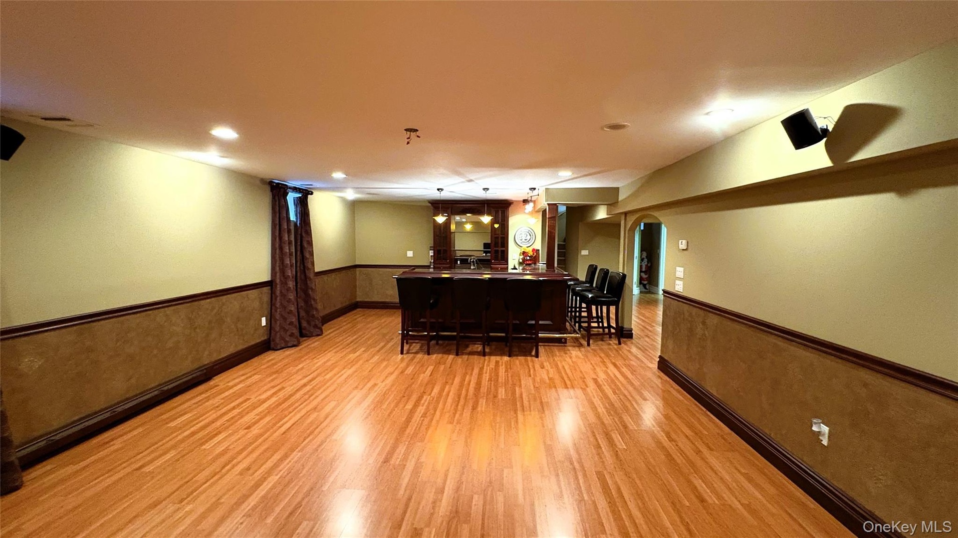 - Indoor dry bar featuring wainscoting, light wood-type flooring, arched walkways, and recessed lighting